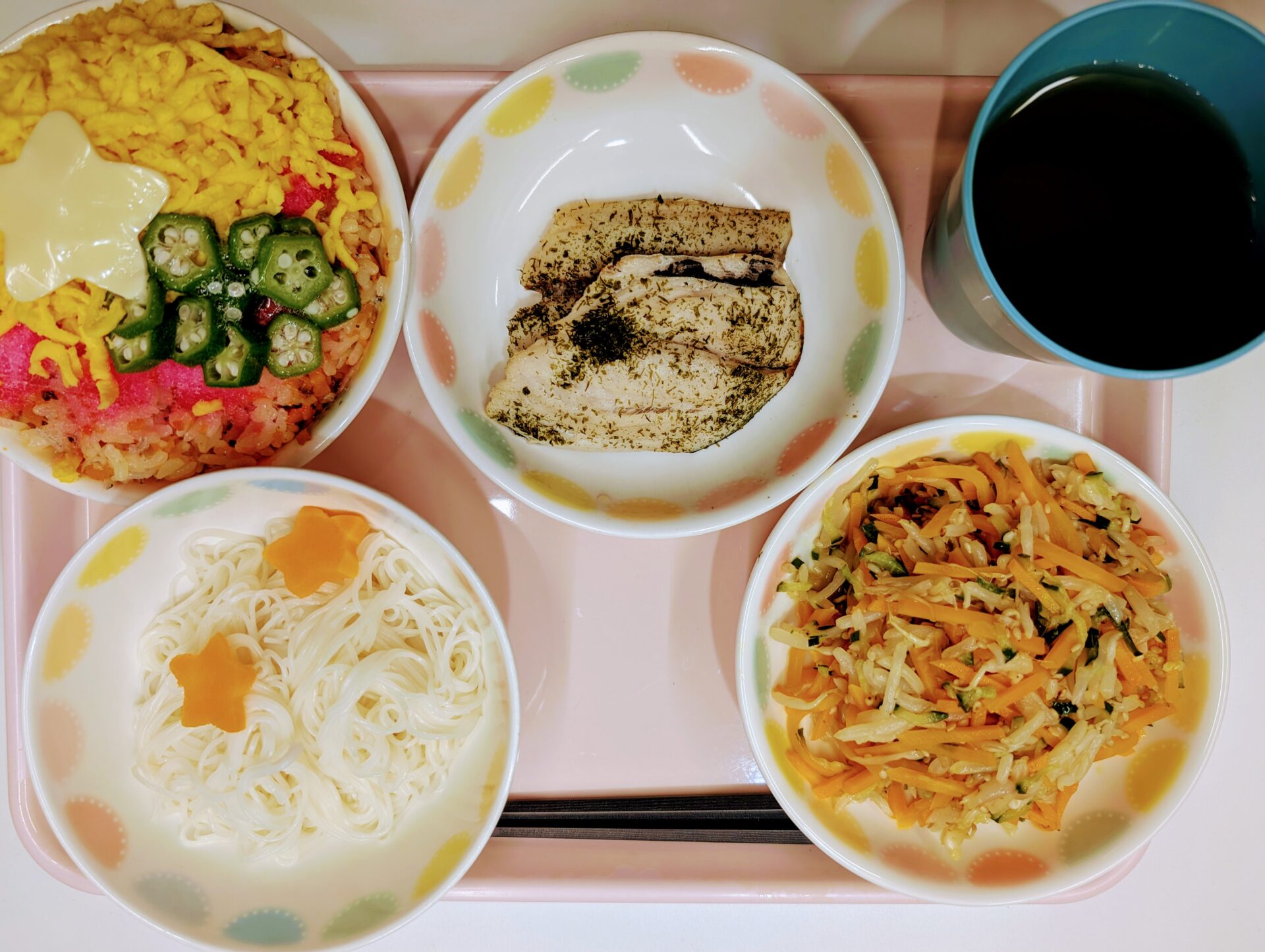 2025.07.07 今日の給食 7月7日の給食 今日は七夕メニューでした! 流しそうめんも楽しんだ後の給食は会話も盛り上がったようです。 ちらし寿司の大きなお星様に目を輝かせていました︎🌟 一覧へ戻る