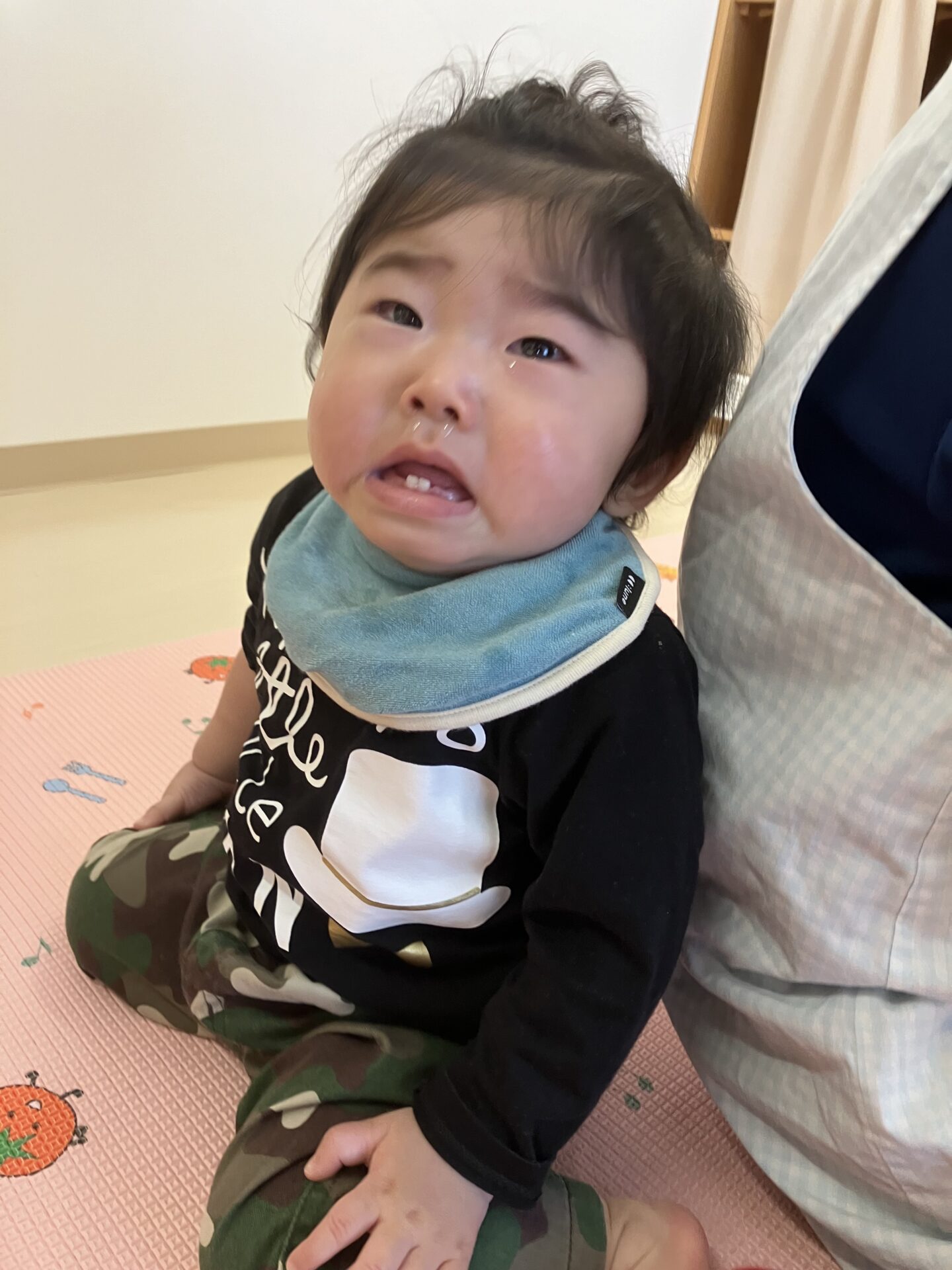 0歳児クラスのお友達、入園初日の泣いていた様子。1ヶ月ですっかり慣れていまではニコニコ登園しています✨