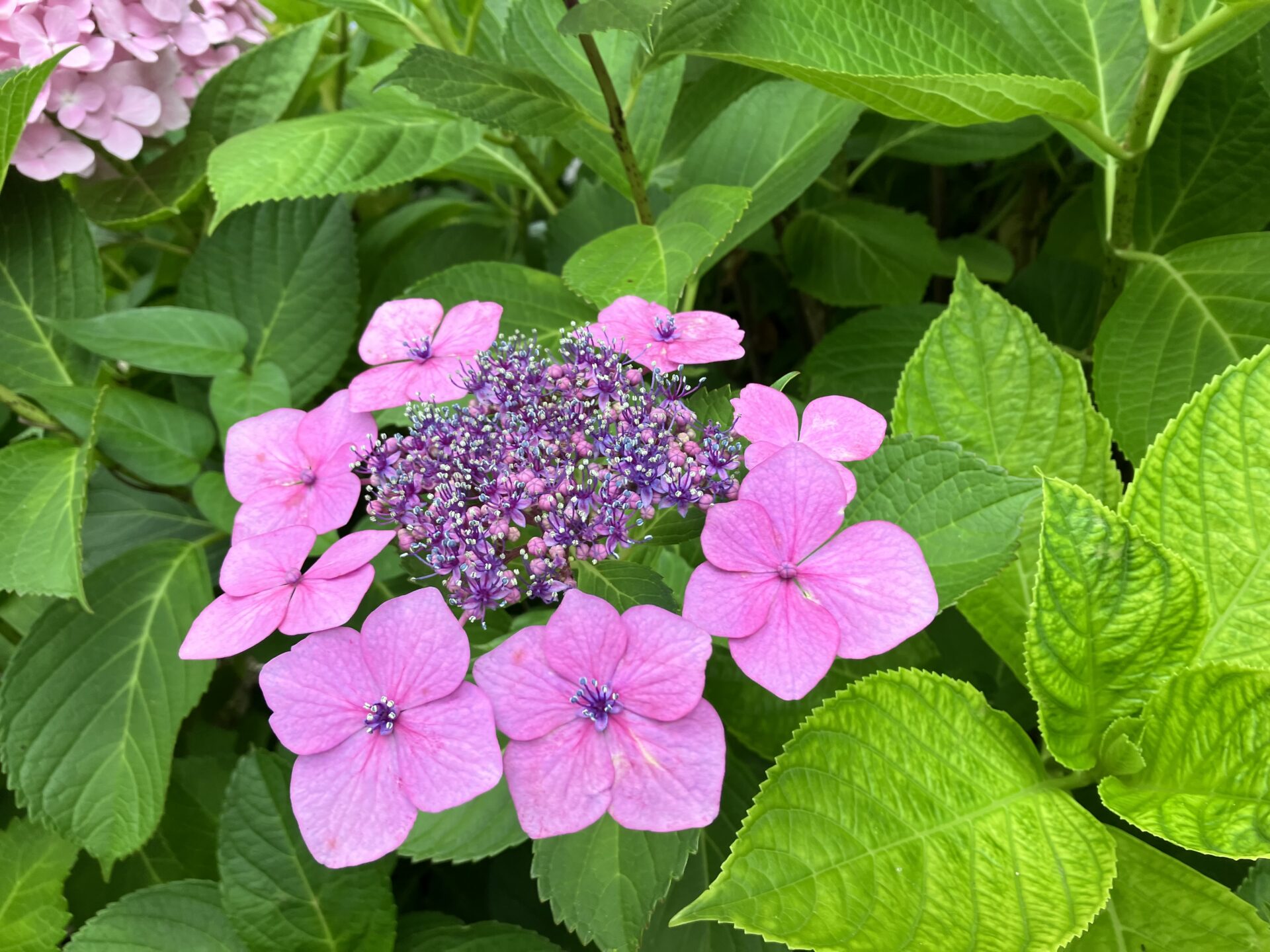 周りの『装飾花』の部分が、真ん中にたくさんある小さな花の部分(本来の花)を額縁のように囲っているのでガクアジサイというそうです。