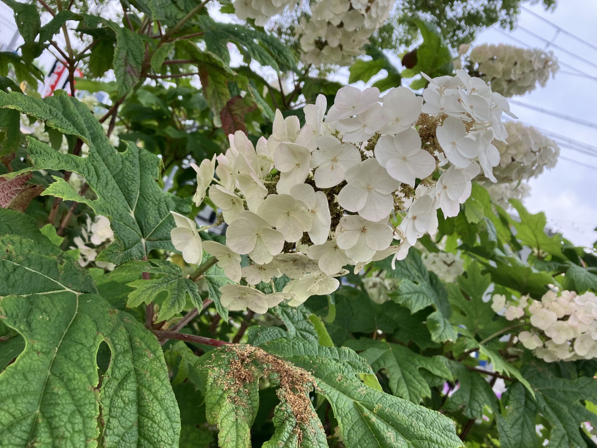 白い三角のあじさいは、柏餅のカシワに似た葉なのでカシワバアジサイというそうです。