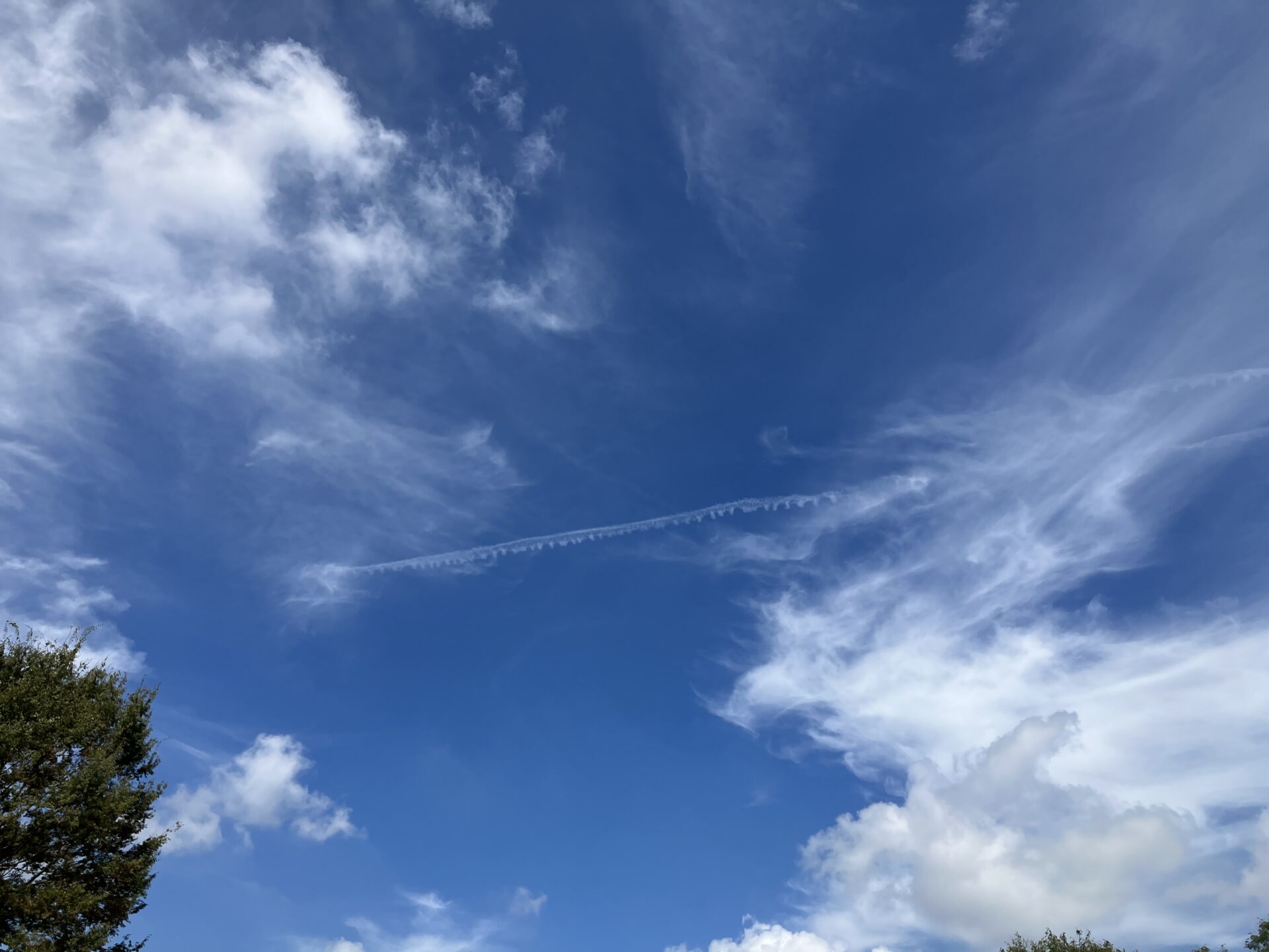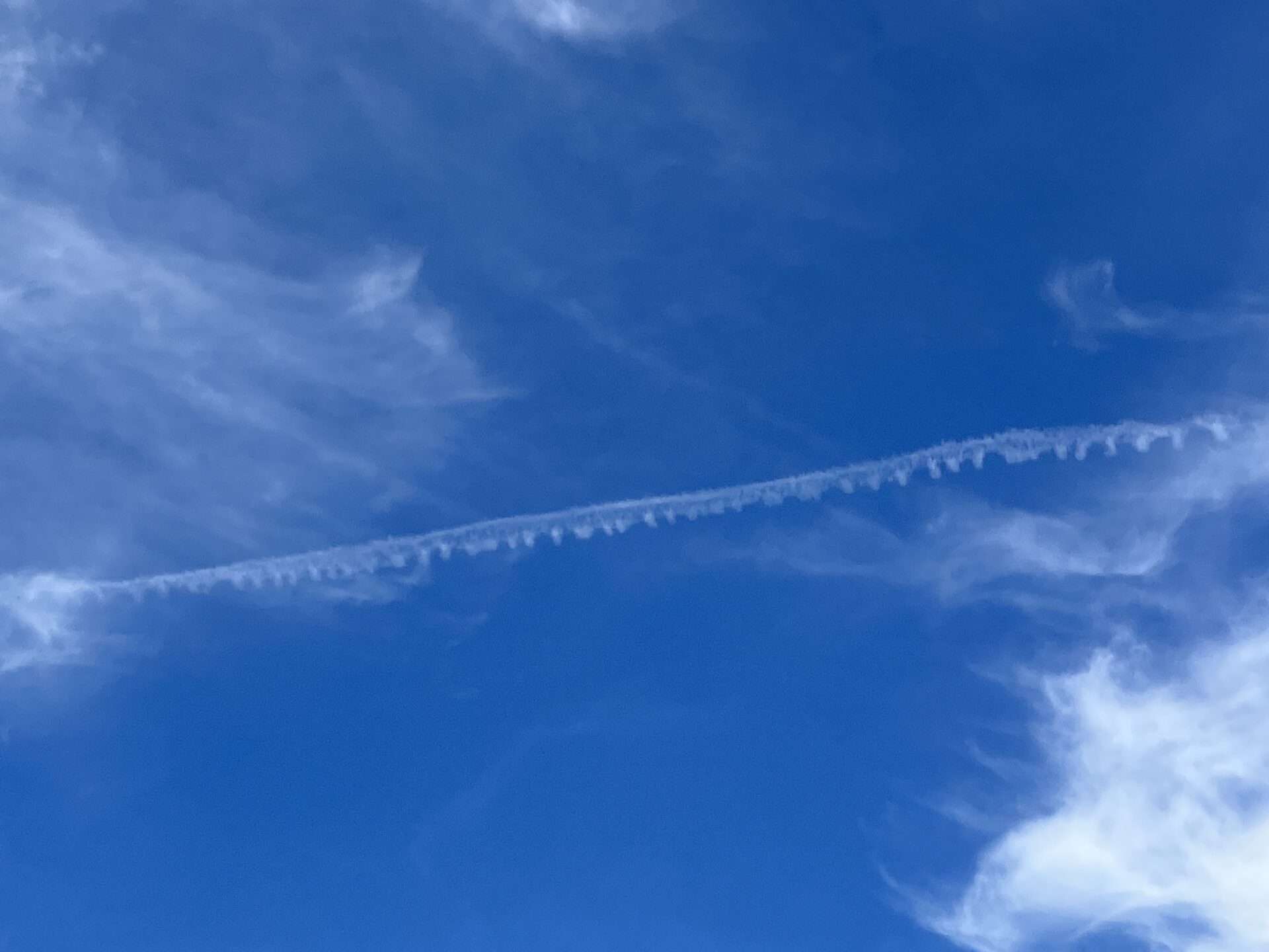 また、空を見上げると白い絵具を水に溶かしたような秋の雲が漂っていました。真ん中に見えるのはレースのように広がった飛行機雲です。