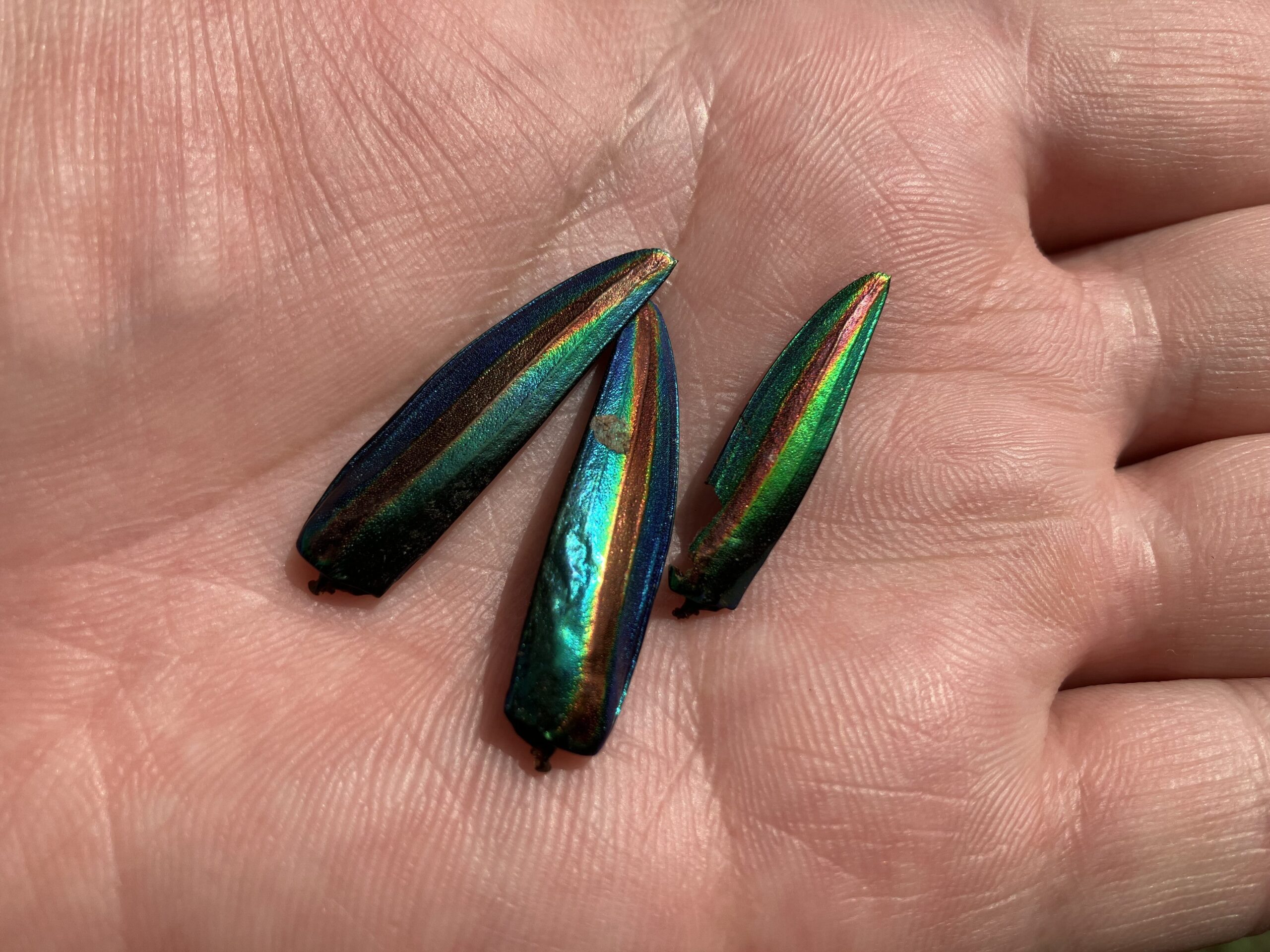 タマムシの羽です。タマムシは古墳から装飾品として出土もしているように実際手に取ると、宝物のようにとてもきれいです。