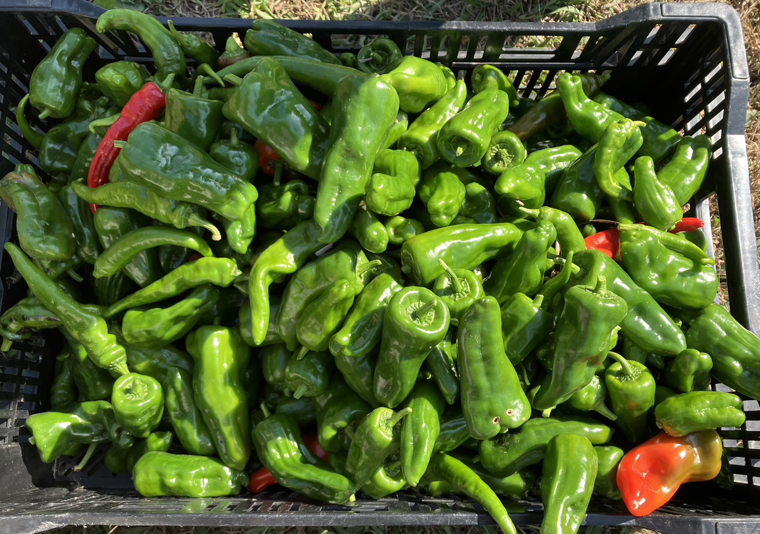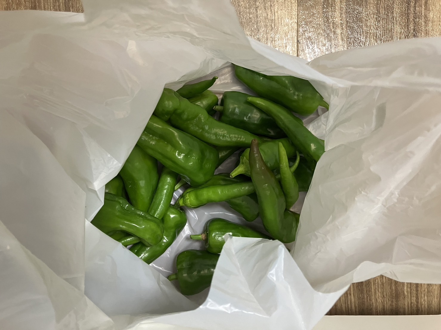 かご2つ分のピーマンと万願寺唐辛子です。