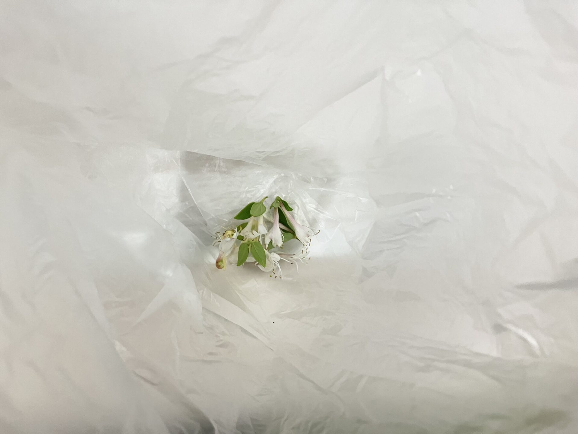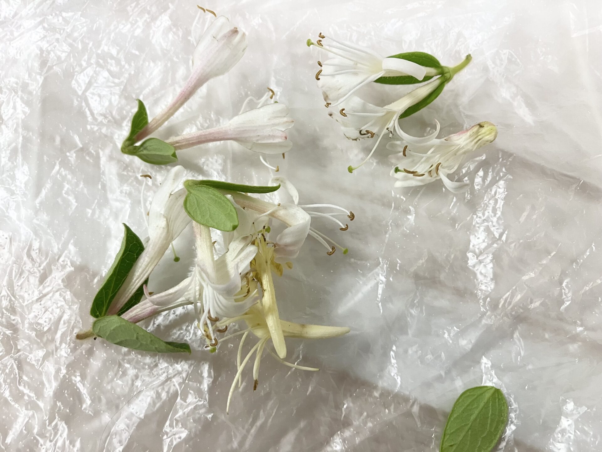 ツツジの垣根からツルが延びて、スイカズラという花を見かけるようになりましたので、花の香りを楽しむ遊び(?)をご紹介します。