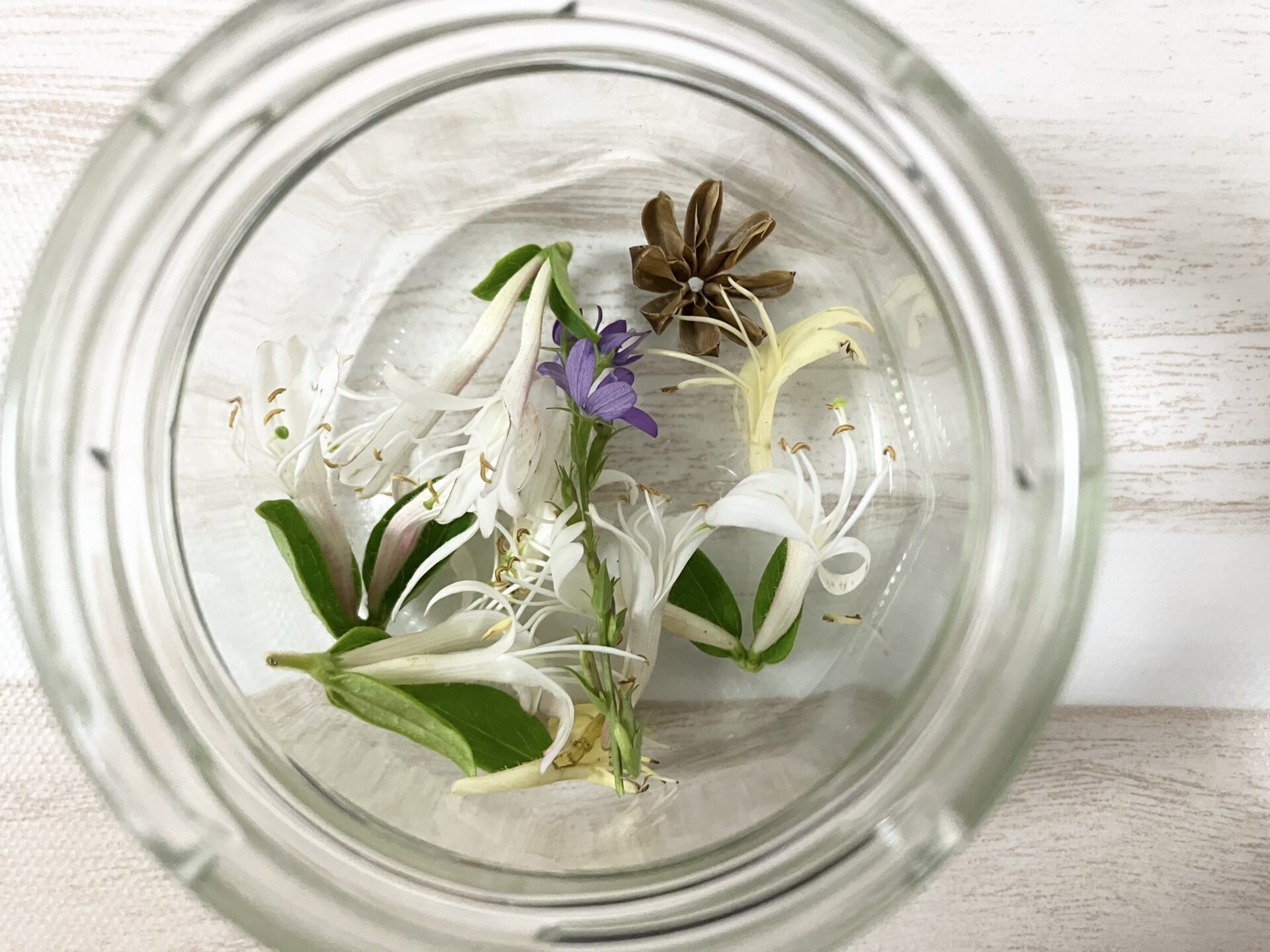 彩よくなるように他の野の花や、今回はサルスベリの実が落ちていたので入れてみました。
