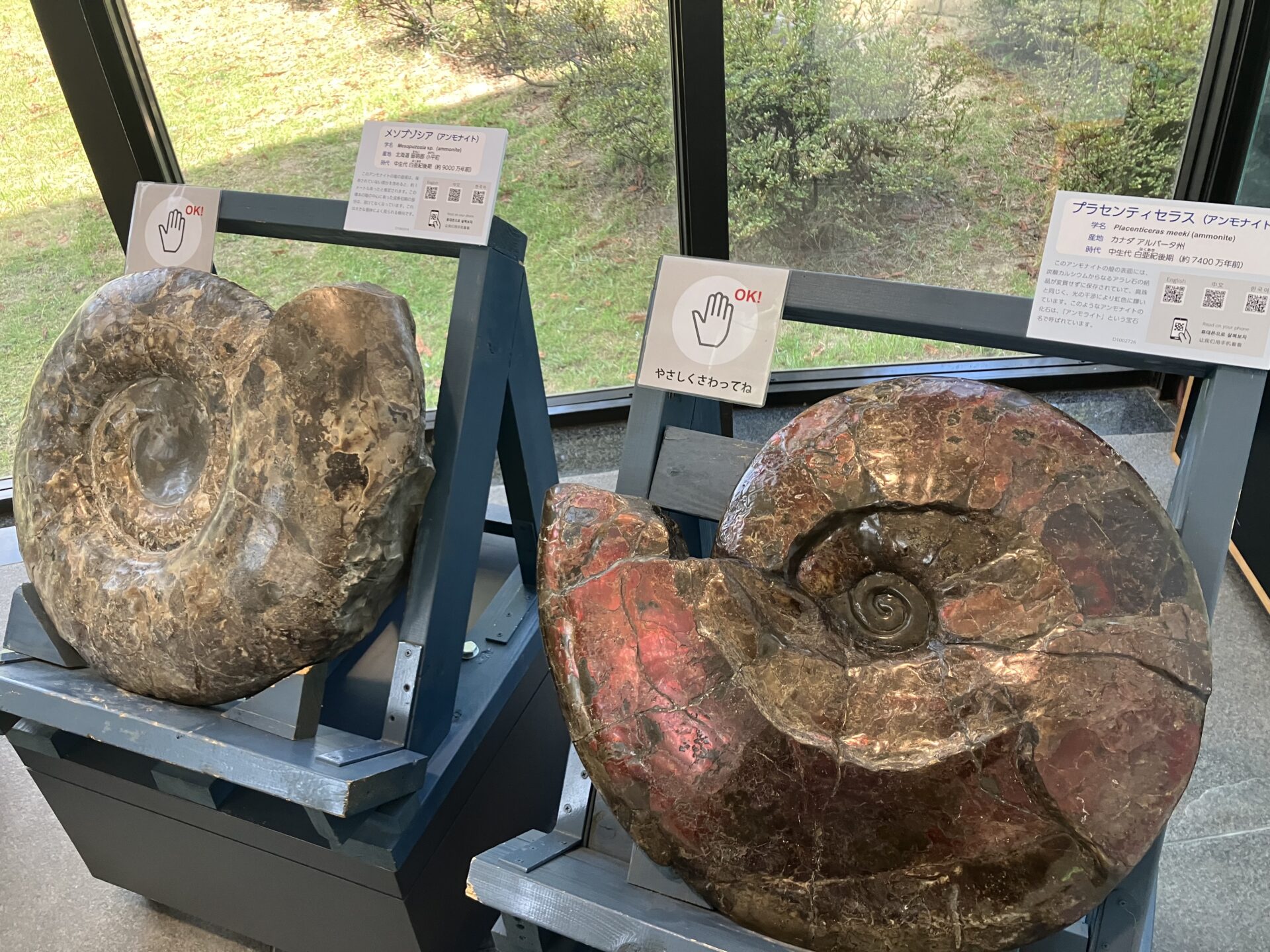 本館前のエントランスでは大きなティラノサウルスのレプリカと、触れるアンモナイトが展示されていてワクワクします。