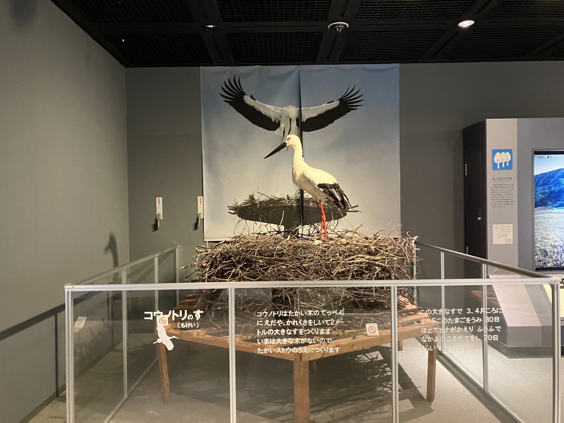 受付から動物の剥製が見えて、少し進んだ先には私たちの大好きなコウノトリにここでも出会えます。