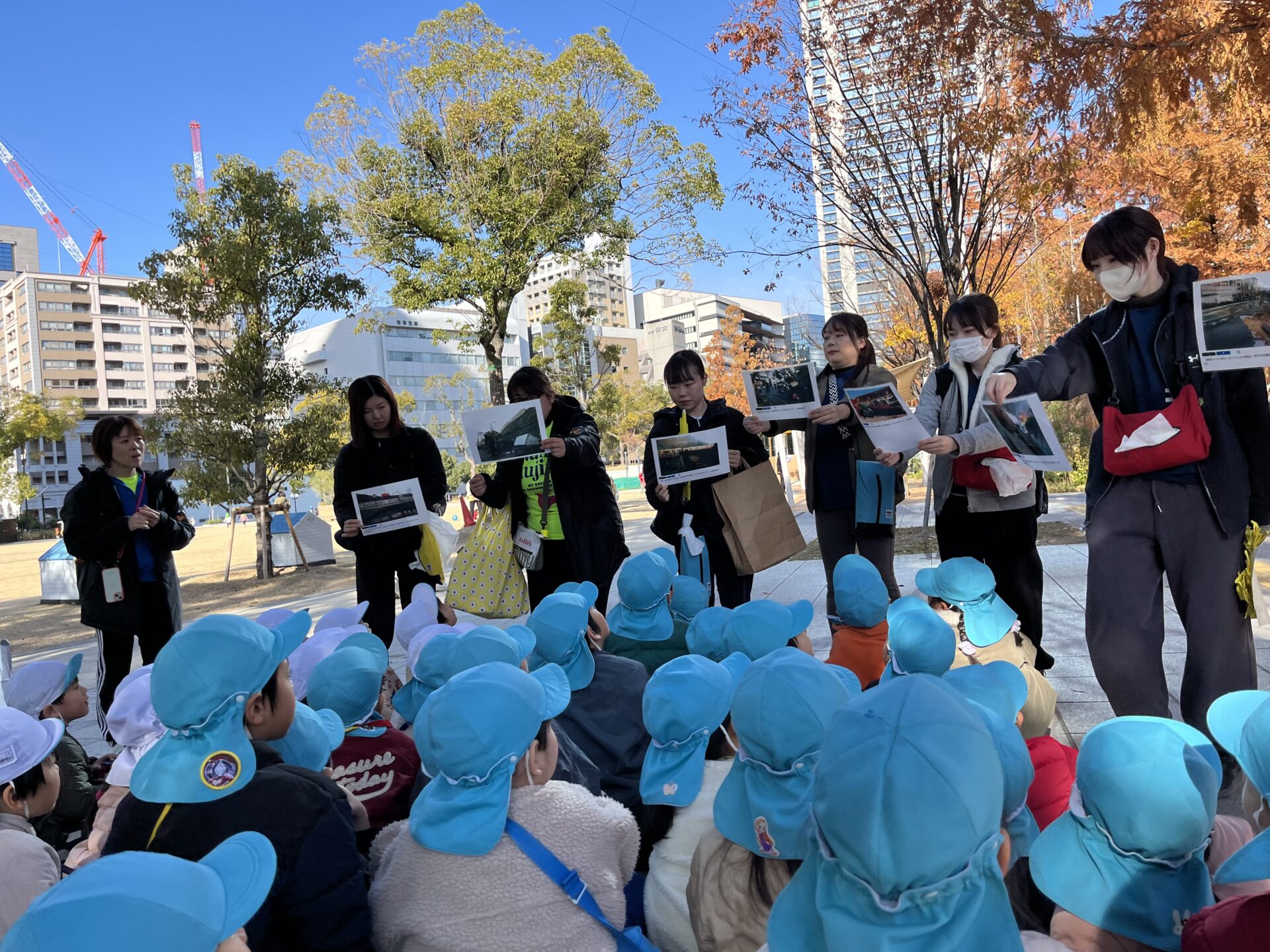 伊丹くじら、梅ノ木くじら、上ノ丸くじらの3園5歳児は、毎年1.17について学び、災害のない平和な日が続くことと、楽しい未来を過ごせなかった方が天国で幸せに過ごせますようにと鶴を折って、神戸三宮 東遊園地寄贈しました。