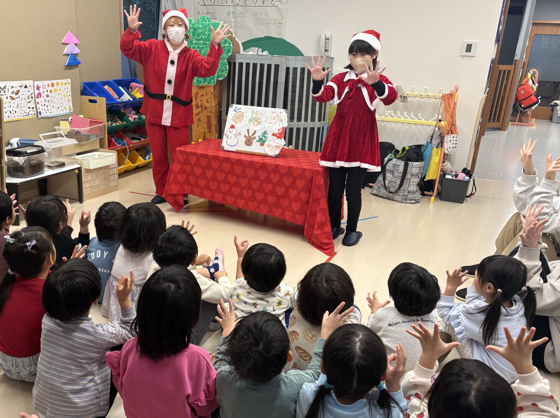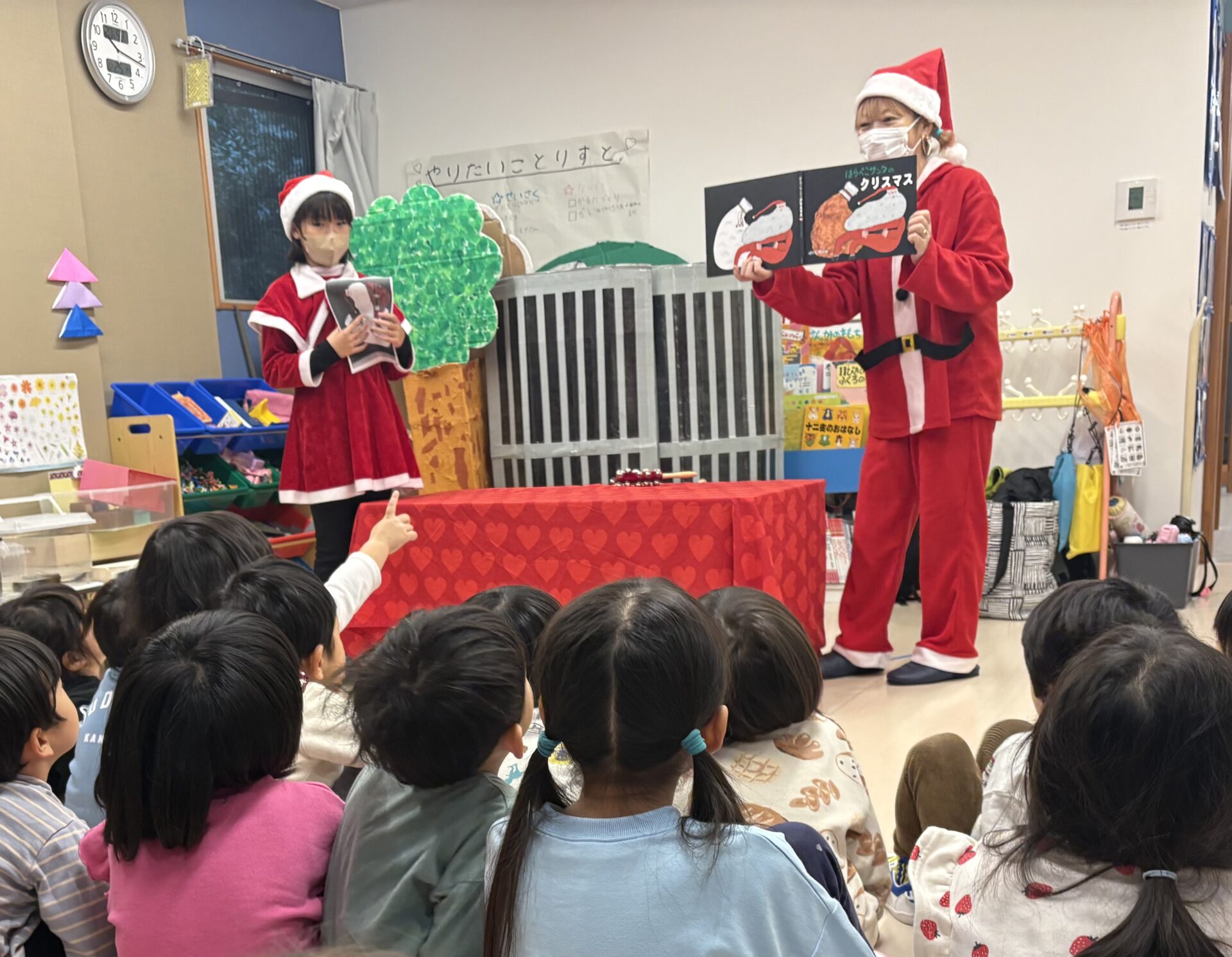 クリスマス一色の雰囲気の中、クリスマス手遊びや、クイズ形式で参加出来る絵本、思わず引き込まれてしまう朗読等、最後まで本当にワクワクする会です!
