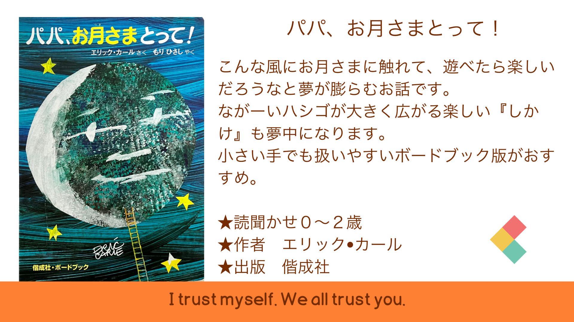 2024.04.07 絵本紹介 『パパおつきさまとって』(お月さまシリーズ①) 保育士パパおすすめの絵本を紹介! お月さまの登場する絵本を6冊紹介します。 毎週月曜日に更新しますのでお楽しみにお待ちください。 一覧へ戻る