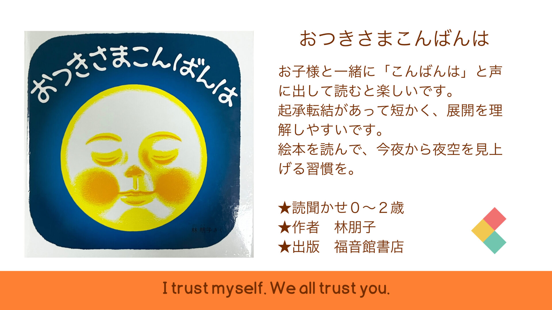 2024.05.06 絵本紹介 『おつきさまこんばんは』(お月さまシリーズ⑤) 保育士パパおすすめの絵本を紹介! お月さまの登場する絵本を6冊紹介します。 毎週月曜日に更新しますのでお楽しみにお待ちください。 一覧へ戻る