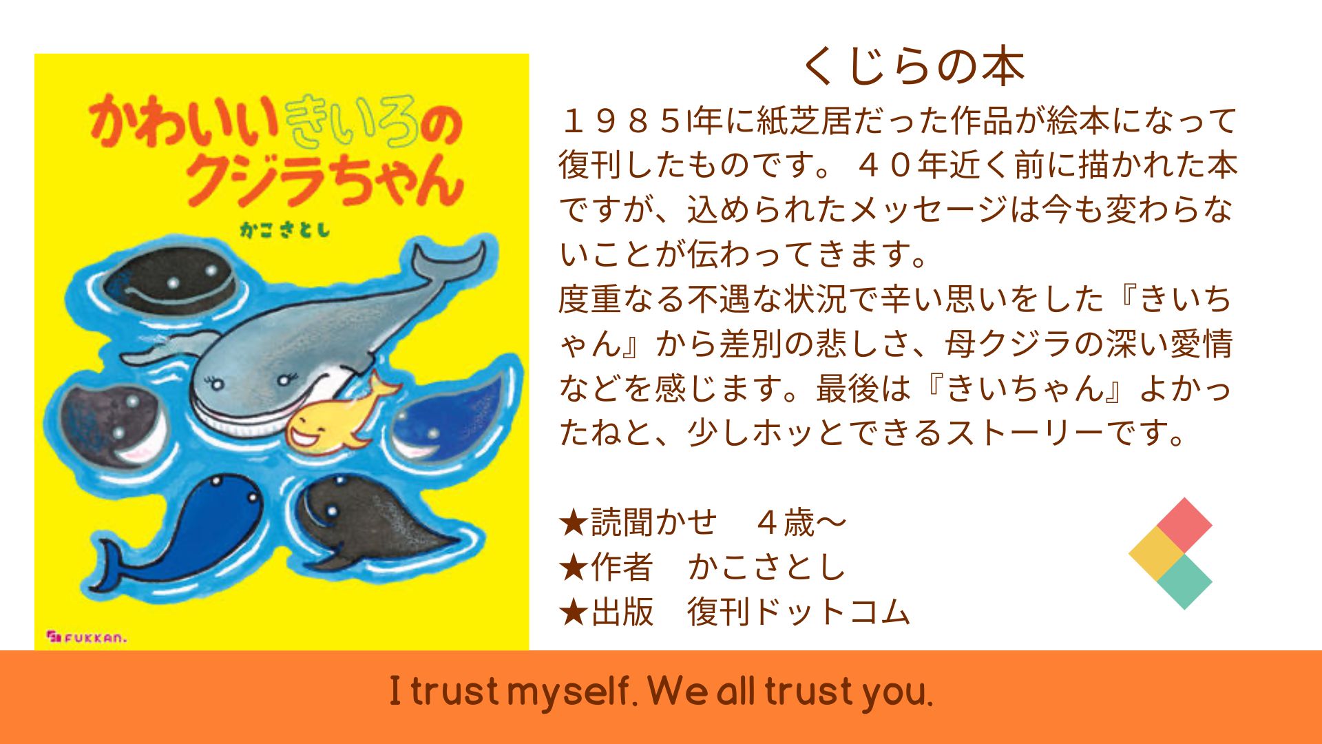 2024.06.24 絵本紹介 『かわいいきいろのクジラちゃん』保育士パパの絵本紹介(くじらシリーズ⑤) 保育士パパオススメの絵本を紹介! くじらが登場する絵本を5冊紹介します。 毎週月曜日に更新しますのでお楽しみにお待ちください。 一覧へ戻る