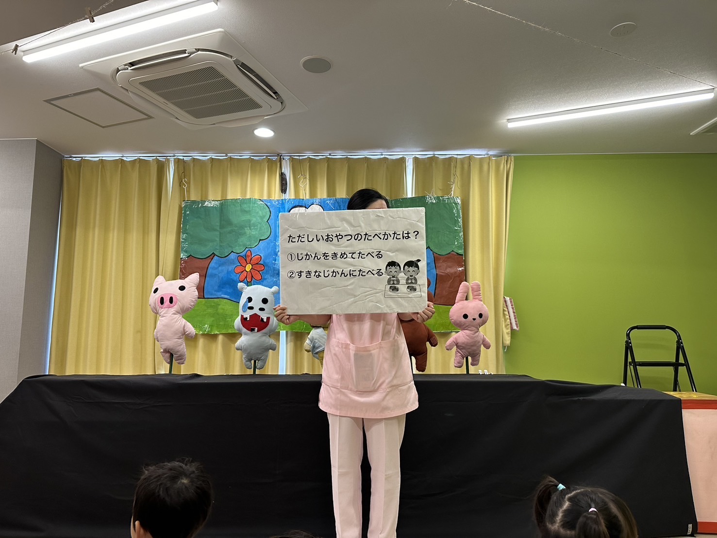 「正しいおやつのたべかたは? ①時間を決めて食べる ➁好きな時間に食べる」というクイズでは自信満々に①に手を挙げる子どもたちでした👏