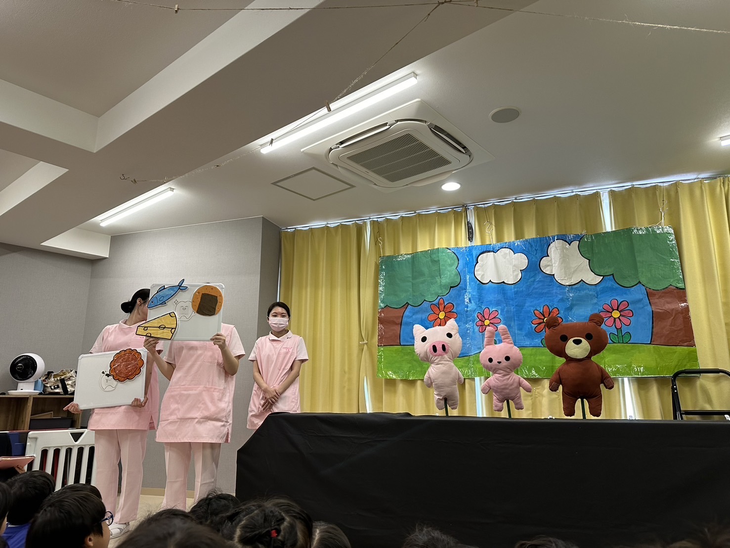 兵庫歯科衛生士学院の学生さんたちをお招きし、虫歯予防の人形劇と歯磨き指導をしていただきました。