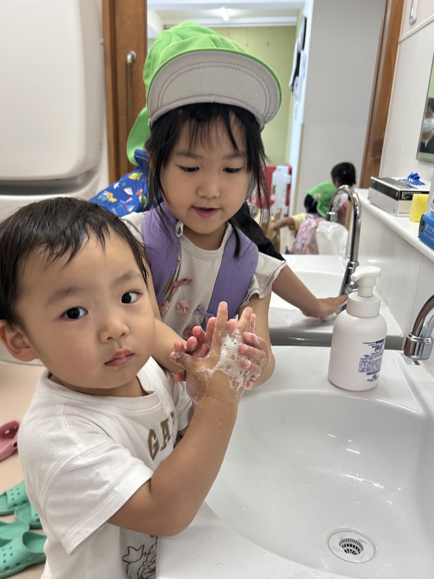 園に帰って来てからも、一緒に手を洗ってもらい、大満足の子どもたちでした💖
