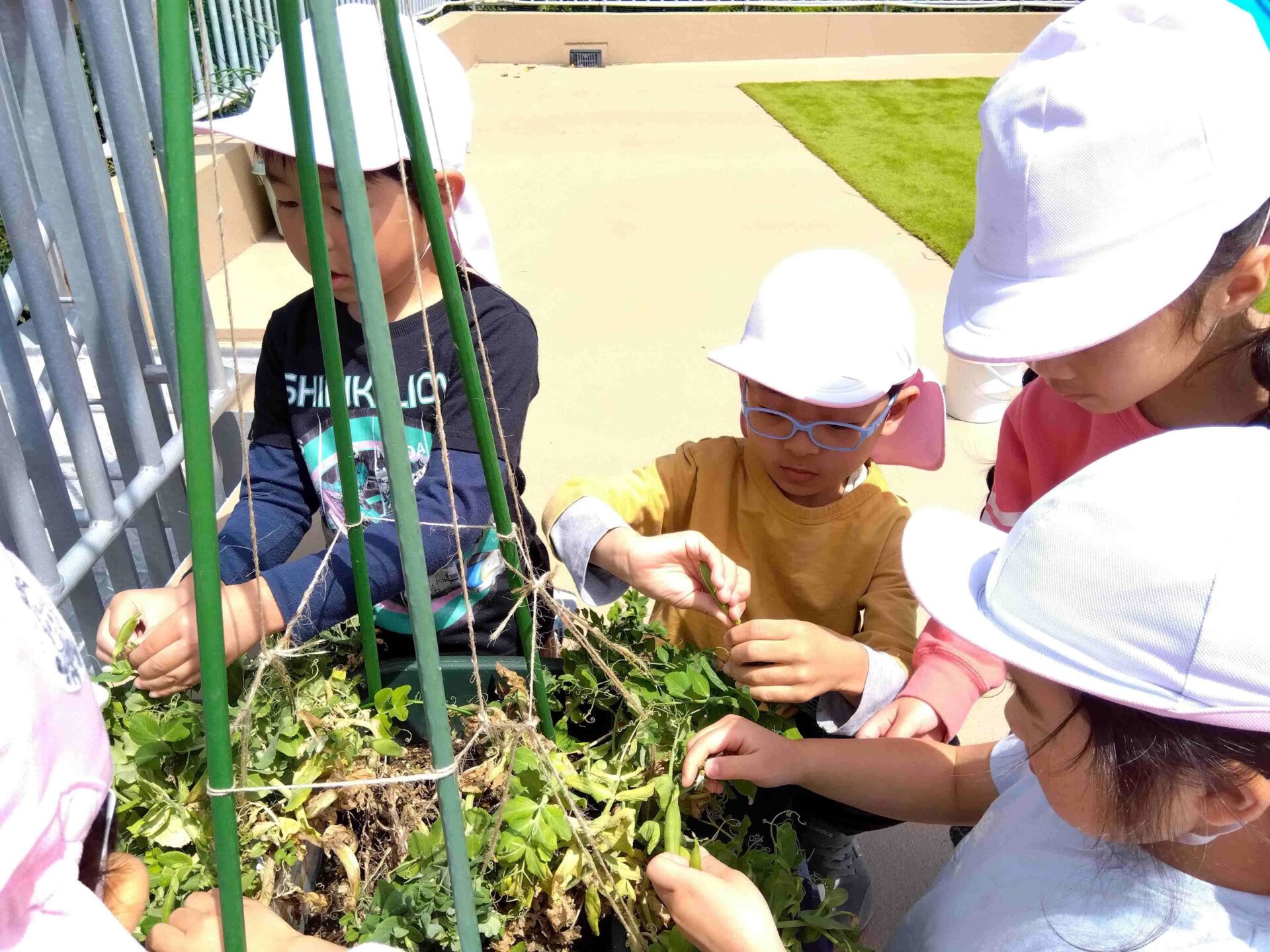 今日は園庭に出ると育てていたスナップエンドウがたくさん実っていたのでみんなで収穫することに!