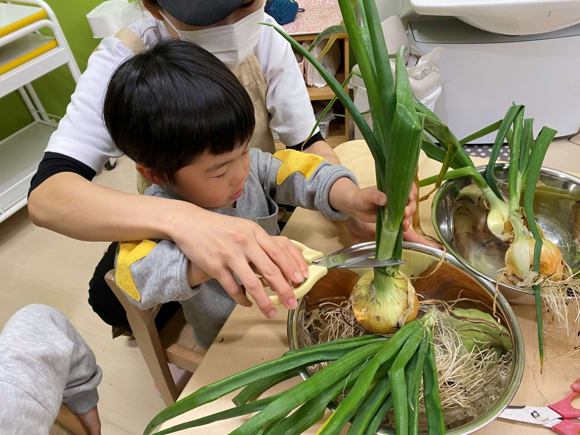 そのあと、給食室に持っていくと「良かったら、葉と根っこの部分切ってみる?」とご提案いただいたので午後みんなで切ってみることに!!