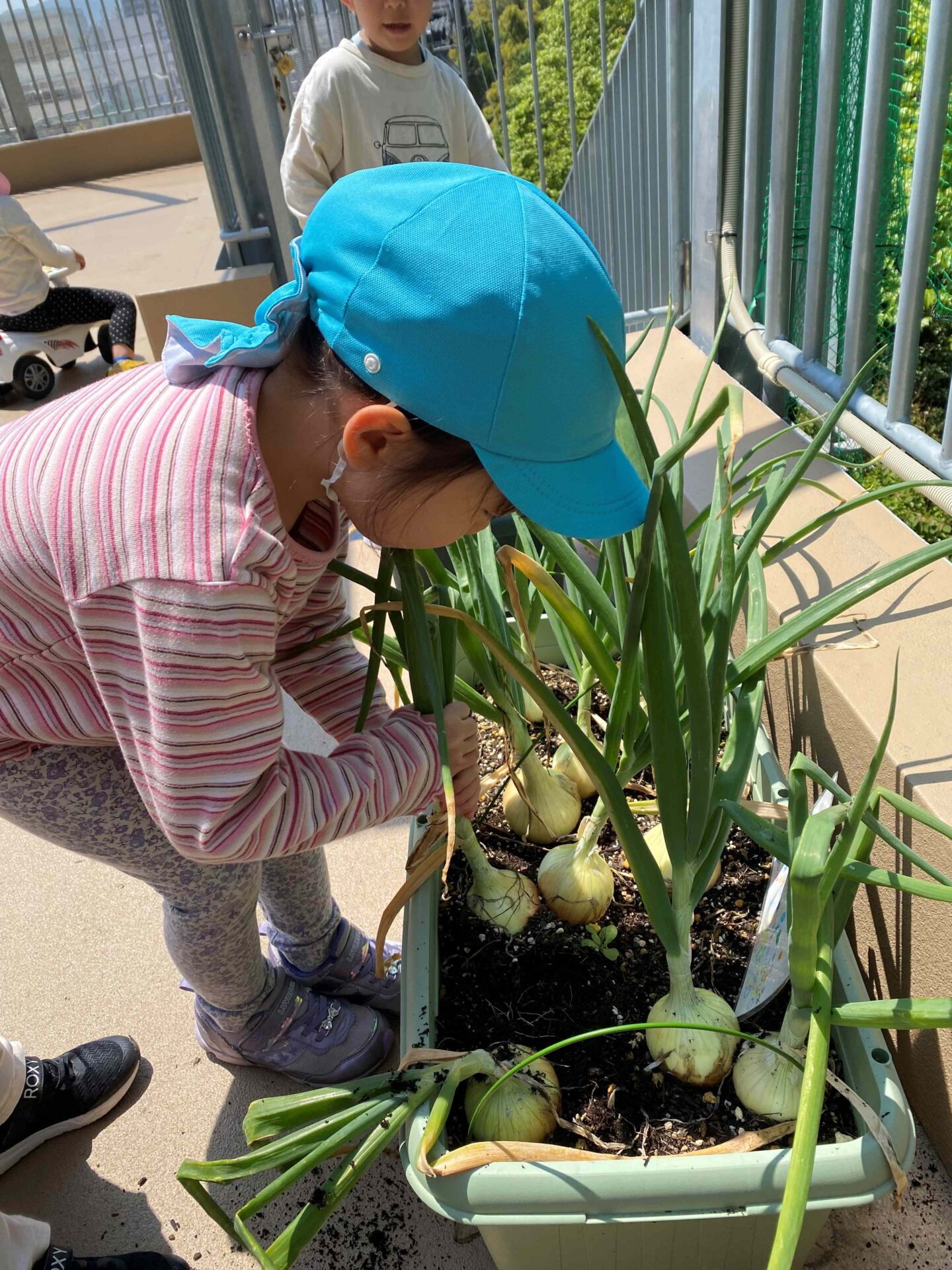 「手がぬるぬるして滑っちゃうよ~」と苦戦したり、根っこがびっしり生えていて思っているよりも力がいりましたが、抜けると「もじゃもじゃだ~」「玉ねぎ大きいね!」と喜んでいました😊