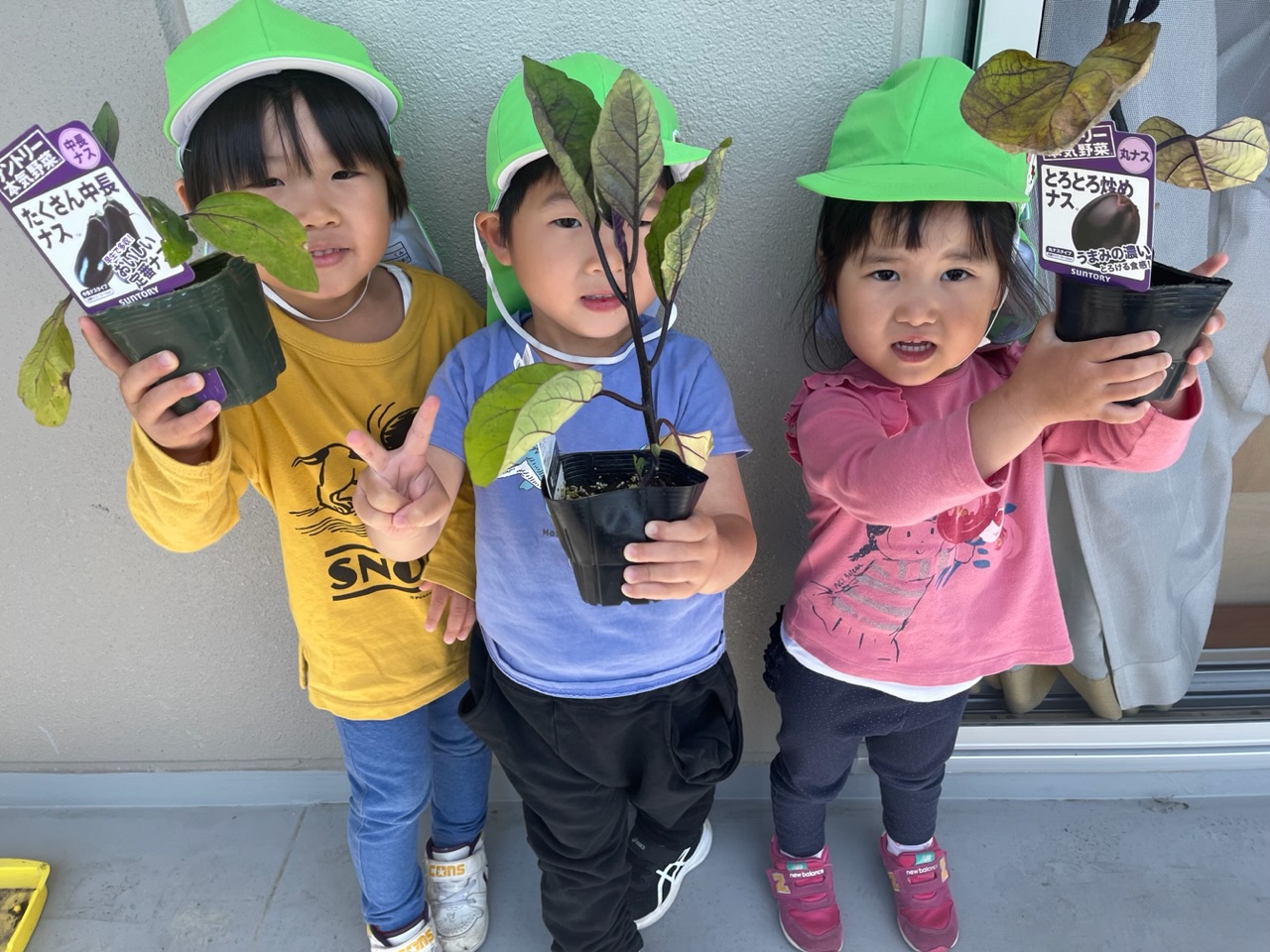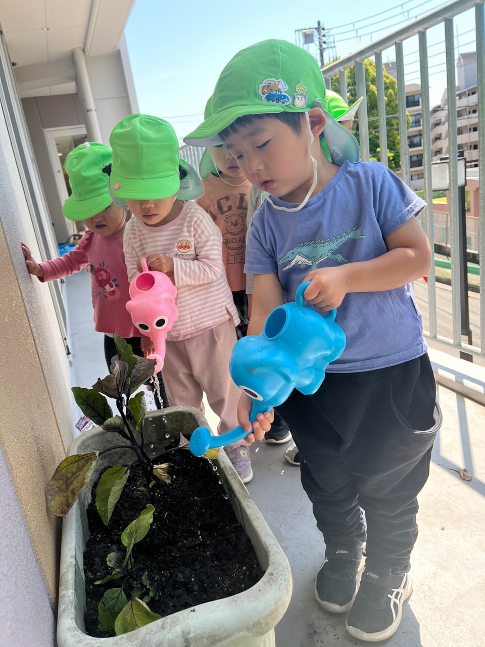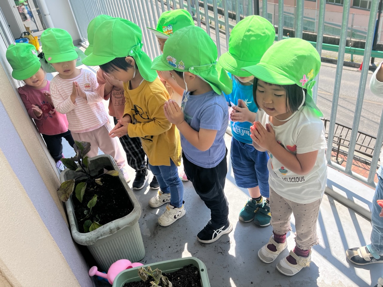 「大きくなりますように。と思いながらお世話すると美味しいナスができるよ。」と担任が話すと、ナスの前で手を合わせ「大きくなりますように」と毎日言っています。
