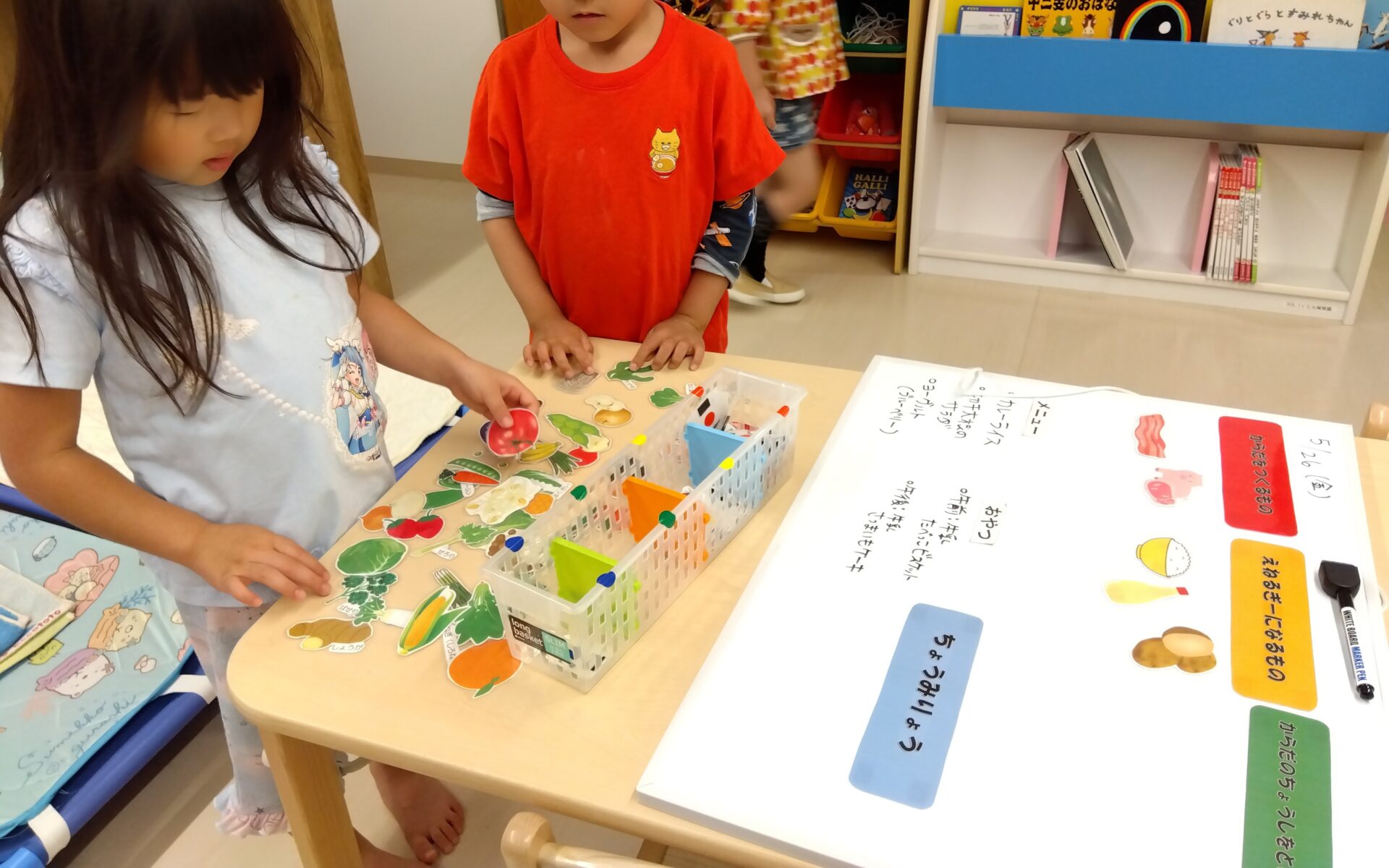 少しづつ食べ物の名前も覚え、お友だちと相談しながら楽しく学んでいます。