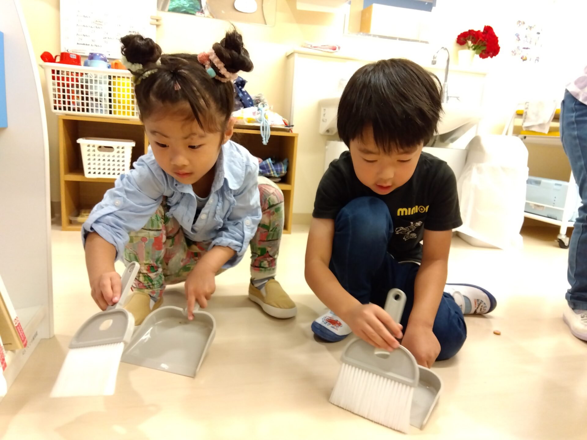 ほうきとちりとりの扱いにも慣れてきて、「こんなにとれたよ!」と嬉しそうに教えてくれます。
