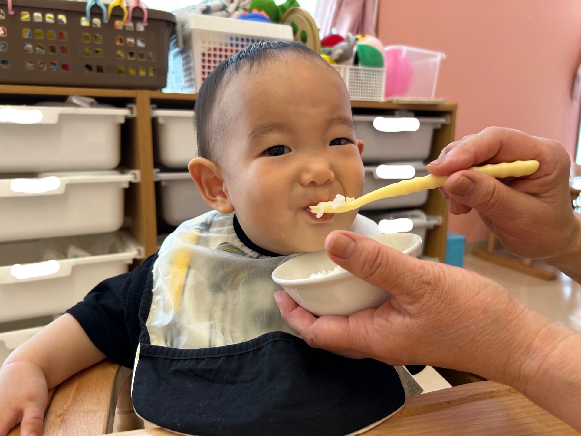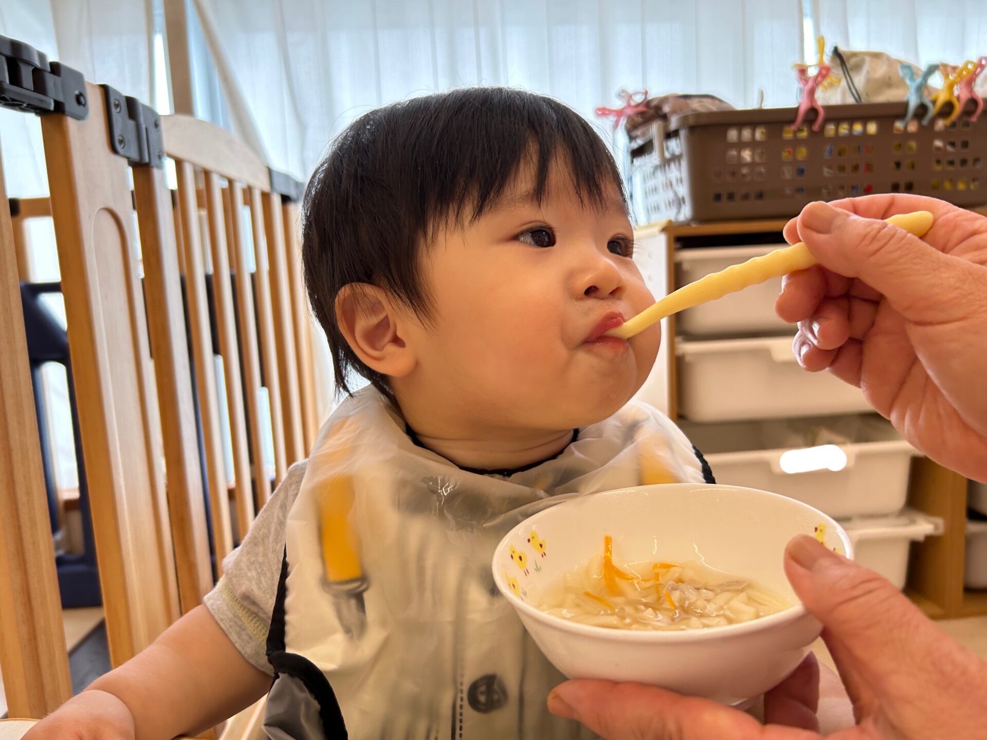 保育士が口を動かしながら「もぐもぐ ごっくん」と伝えると、口を動かして食べています。少しずつですがしっかりと噛んで食べる事が上手になってきました。