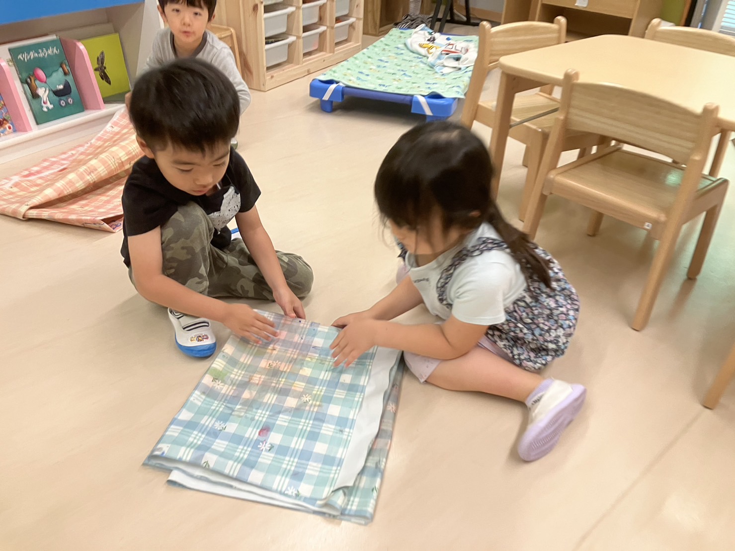 最初は保育士が『友達と一緒にこうやって、たたんで片付けようね』と話をしたのだと思いますが何も言わなくても自分たちで取り組んでいます。