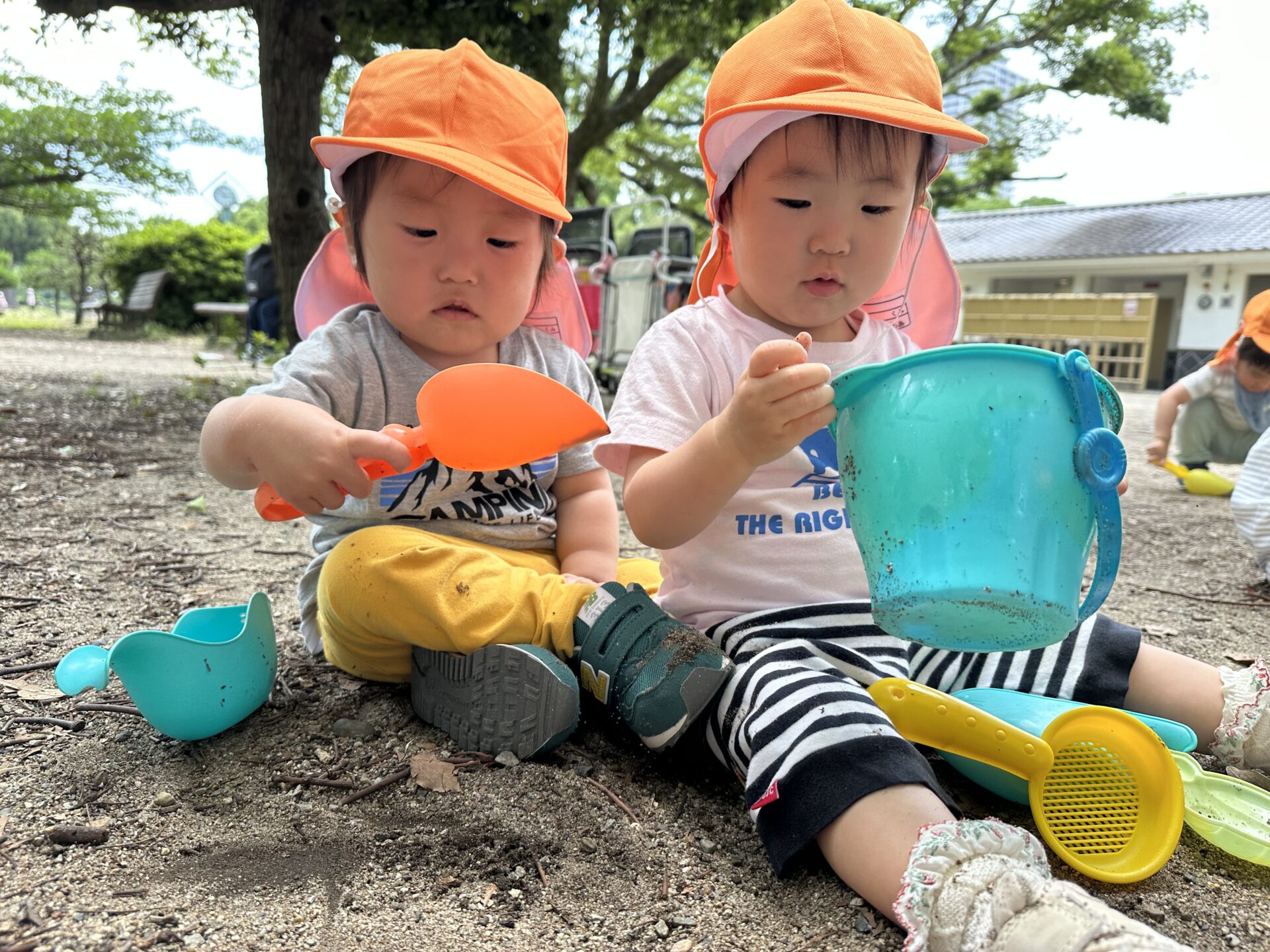 砂遊びセットを持ってお散歩した日には、砂まみれになって楽しんでいた子ども達です♪