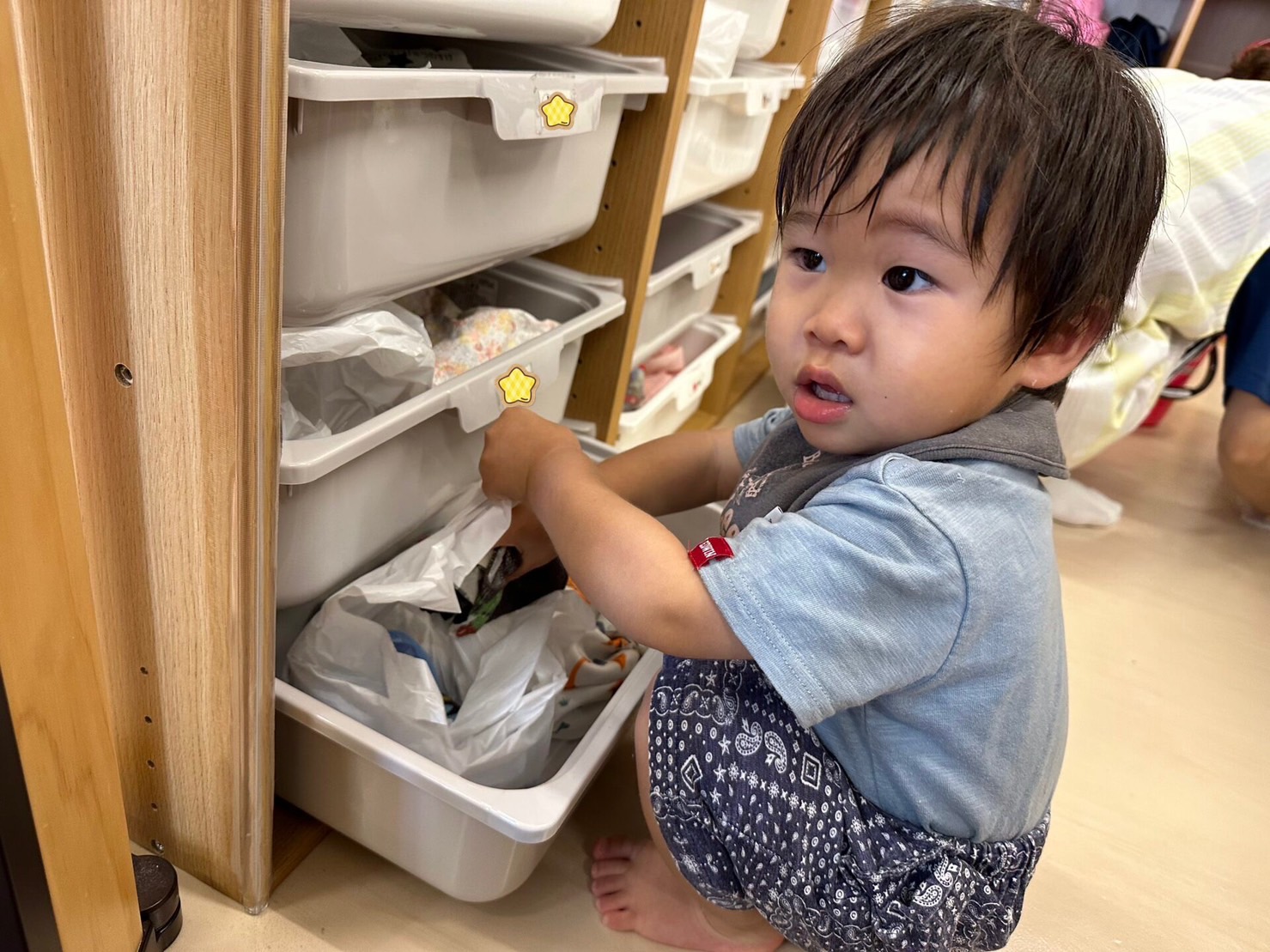 食べ終わったらエプロンと口拭きタオルを自分のマークが付いている引き出しに片づけます。