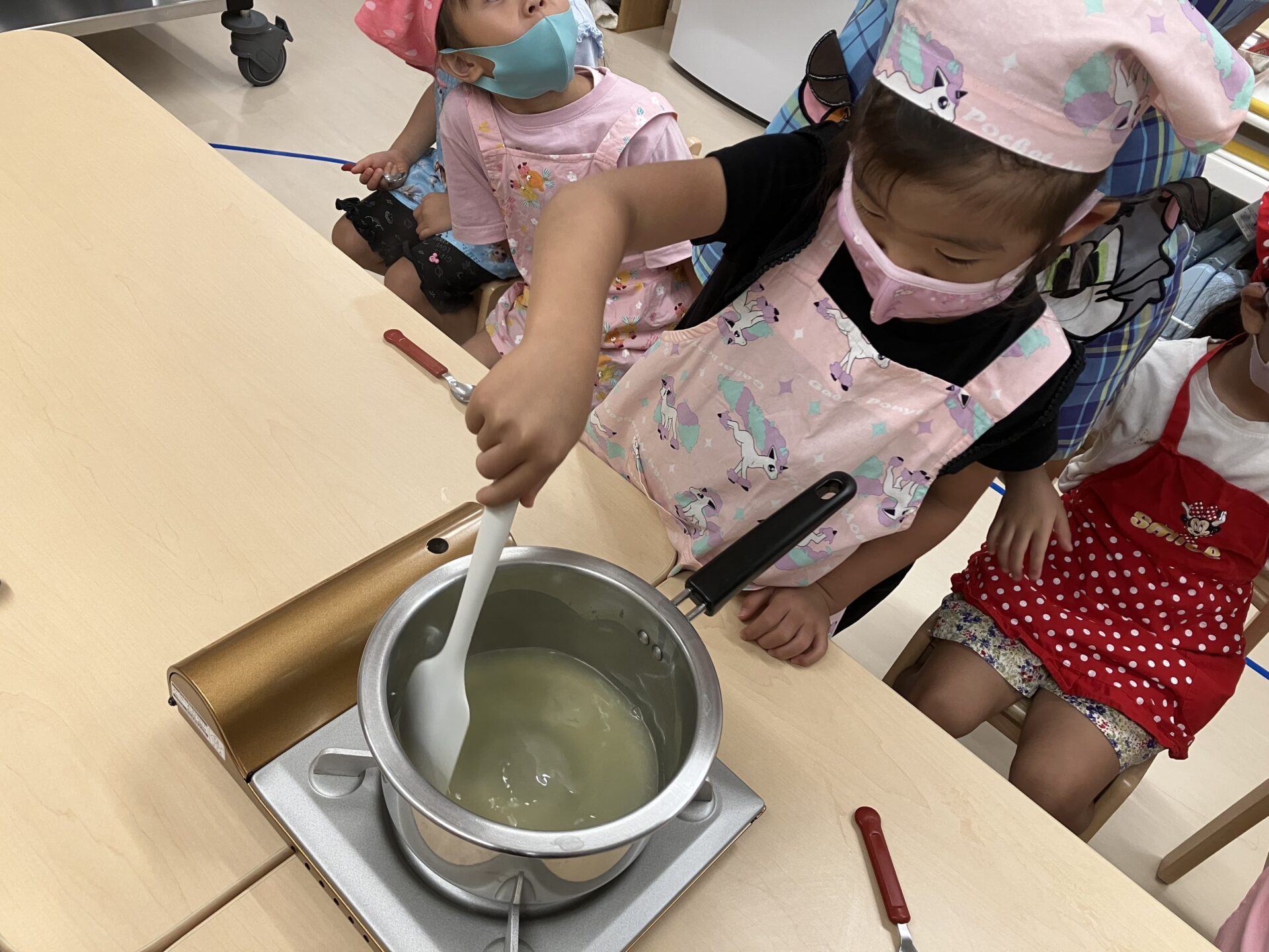 砂糖が溶けないので加熱しながら、みんなで「おいしくなーれ」の大合唱。