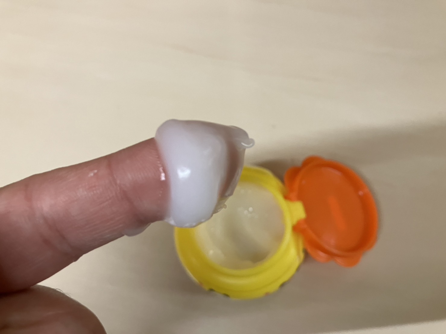 つけすぎたのりは、容器のフチに指をあててそぎ落として戻します。