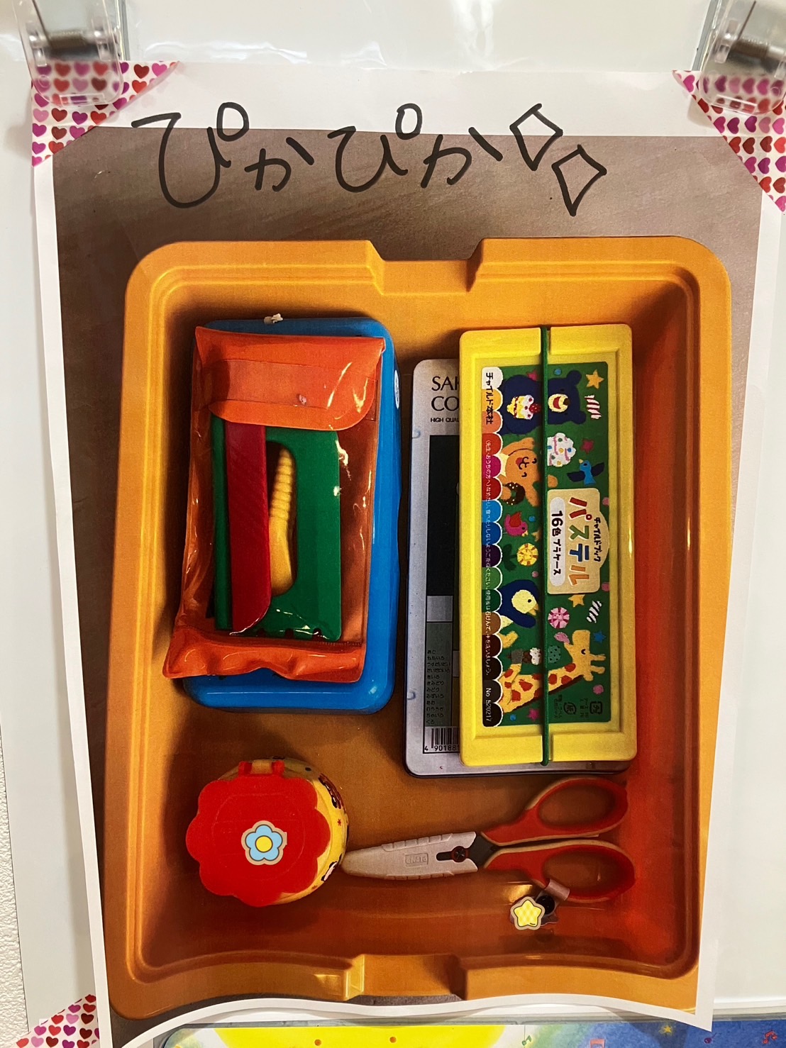 色鉛筆の前に4月から道具箱を初めて使い始めた3歳児クラスの整理整頓のお話をします。
