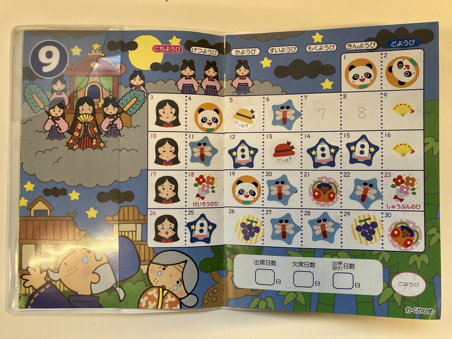 この写真は今年4歳児クラスで使っている物語のシール帳で、十五夜の9月に合わせて『かぐやひめ』のお話です。「かぐやひめってどんなお話なの?」と昔話に興味をもつきっかけになります。