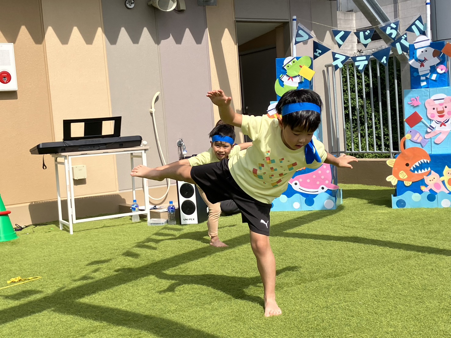 5歳児くじら組の子どもたちは、今年の運動会へ向かってダンス、組体操、障がい物リレーに取り組んできました。