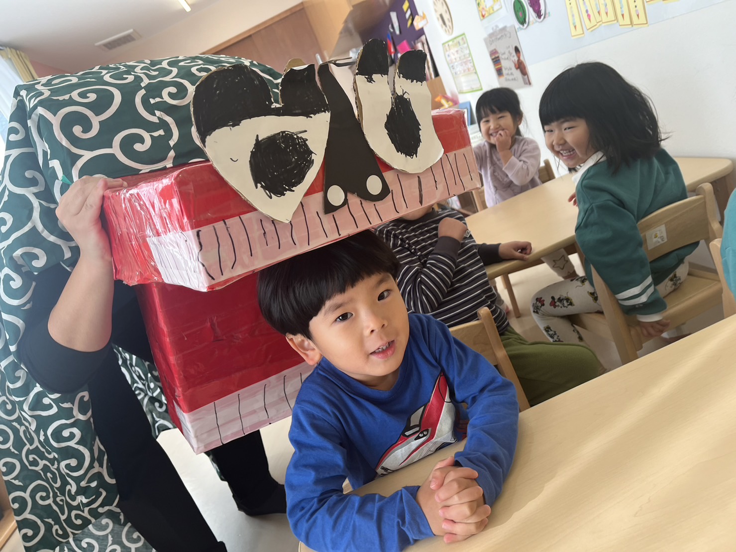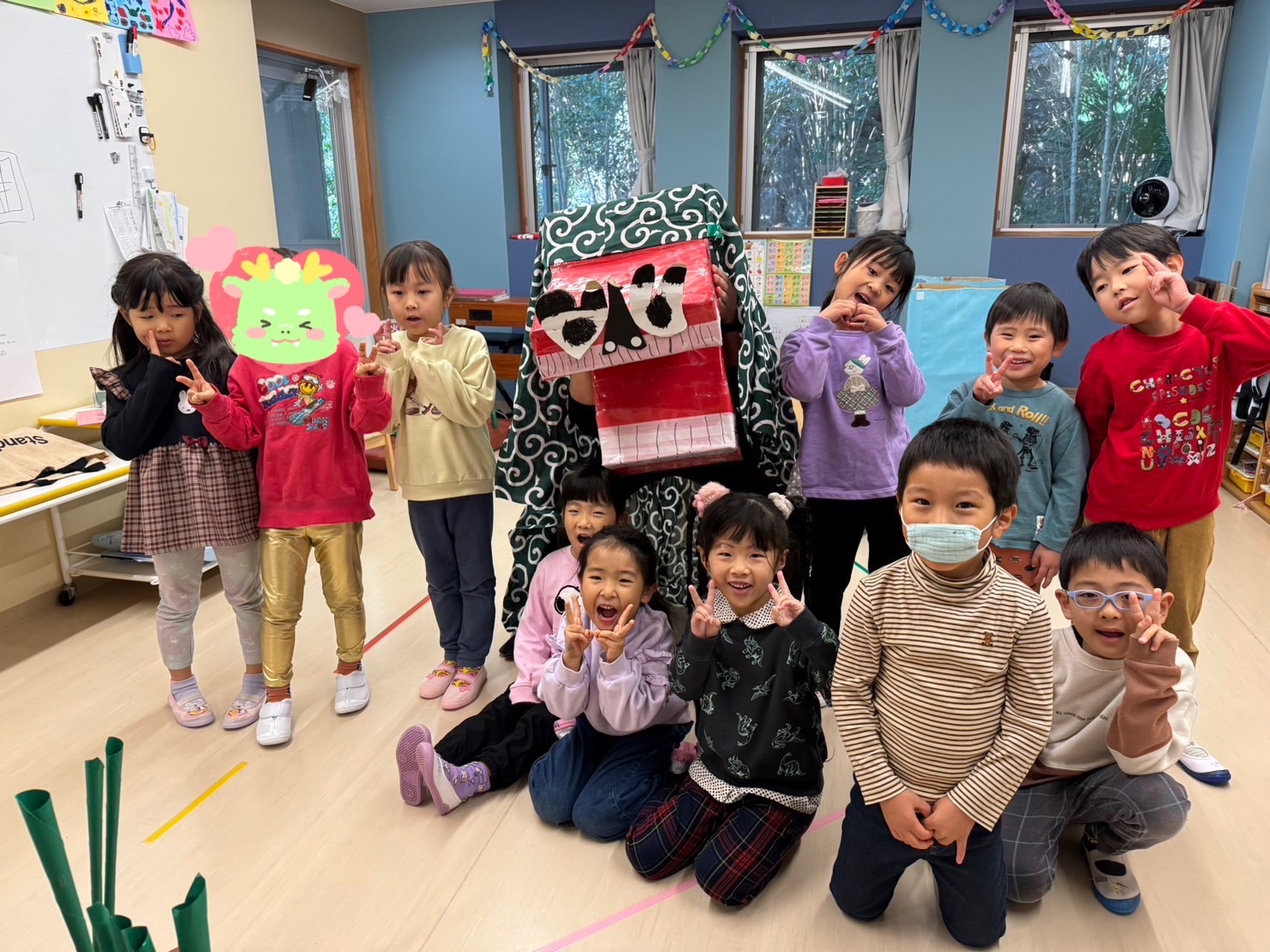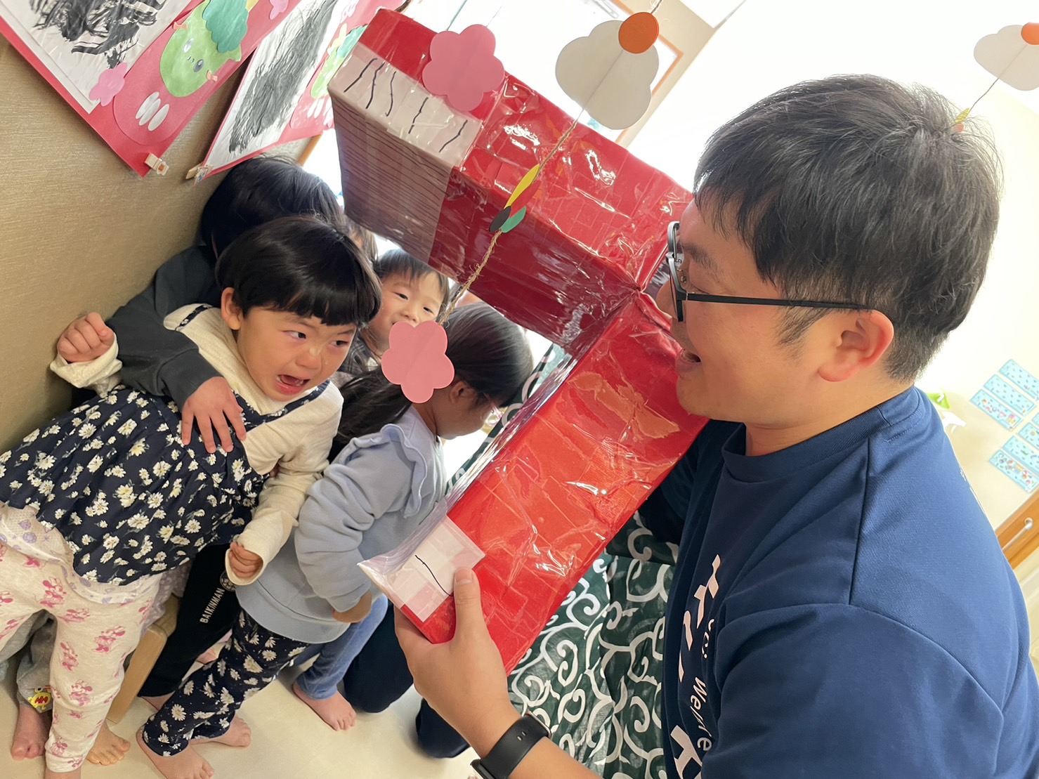 「獅子舞の中は園長先生だから怖くないんだよ~」と言っていますが、よくわからない見た目の物は怖いですよね…泣いてしまいました。
