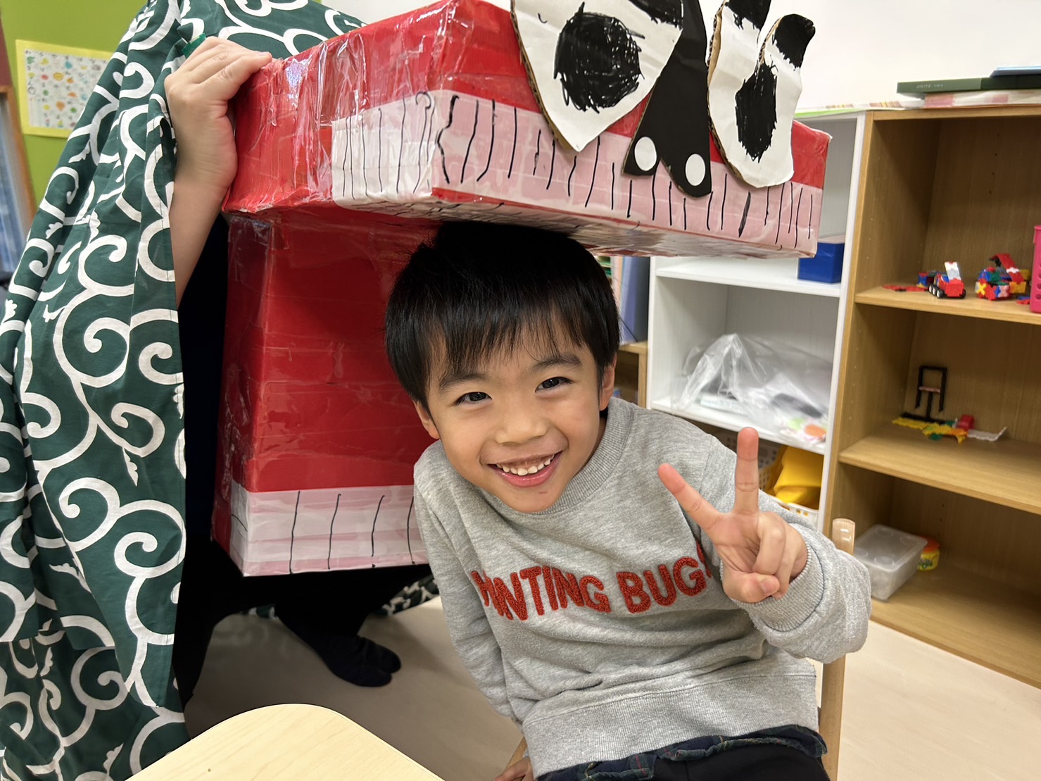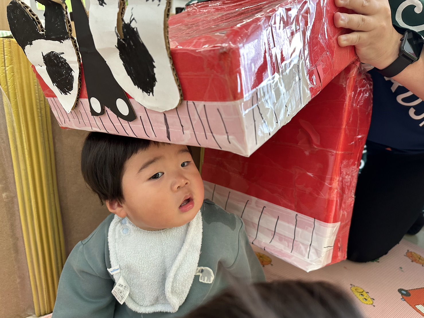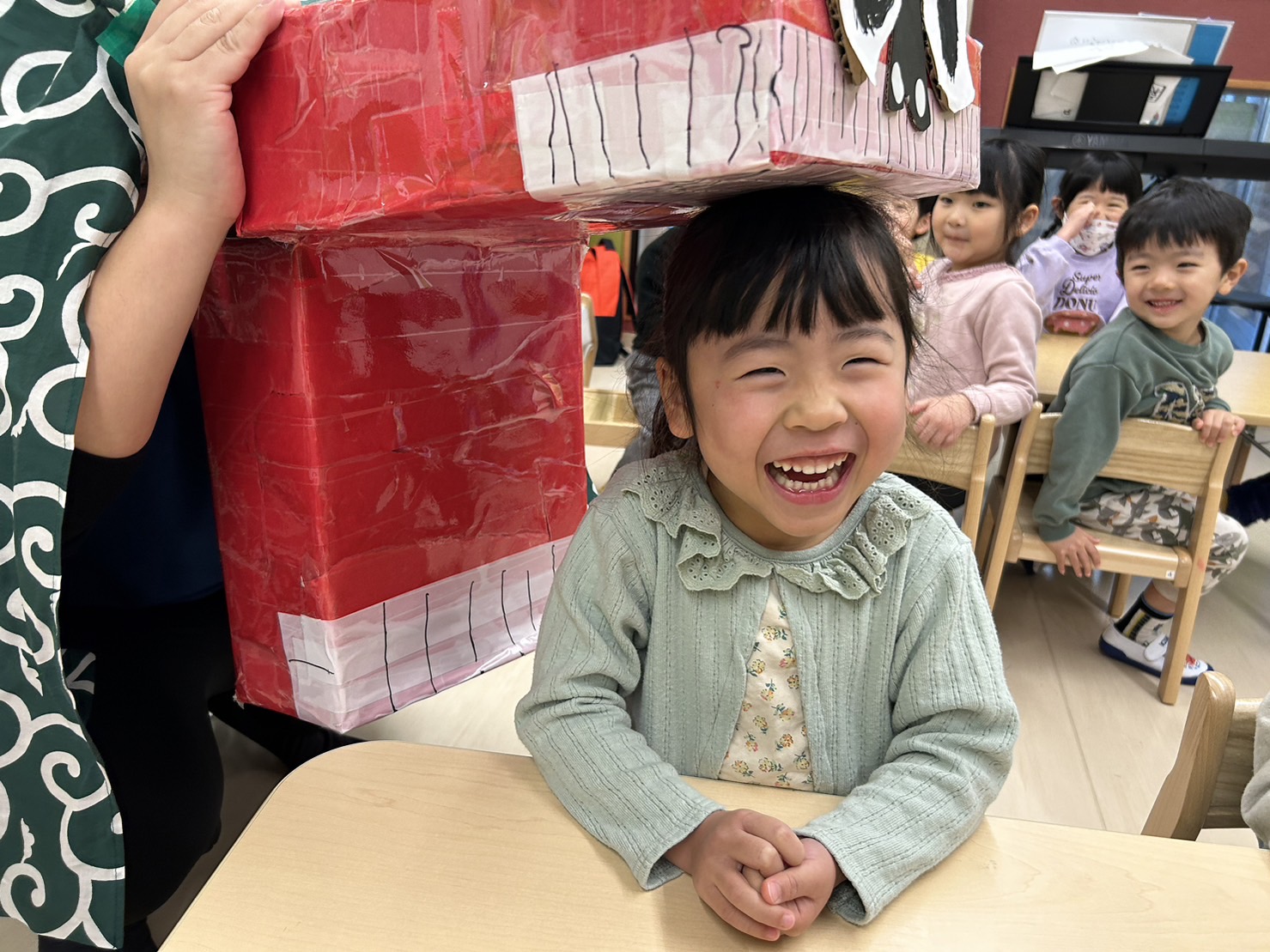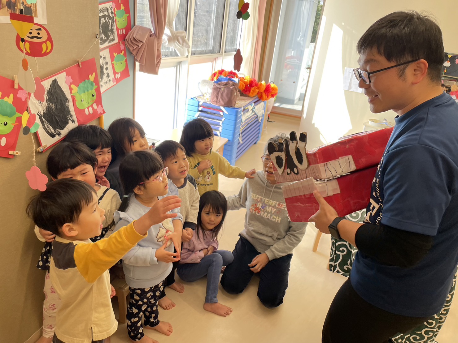 「獅子舞の中は園長先生だから怖くないんだよ~」と言っていますが、よくわからない見た目の物は怖いですよね…泣いてしまいました。