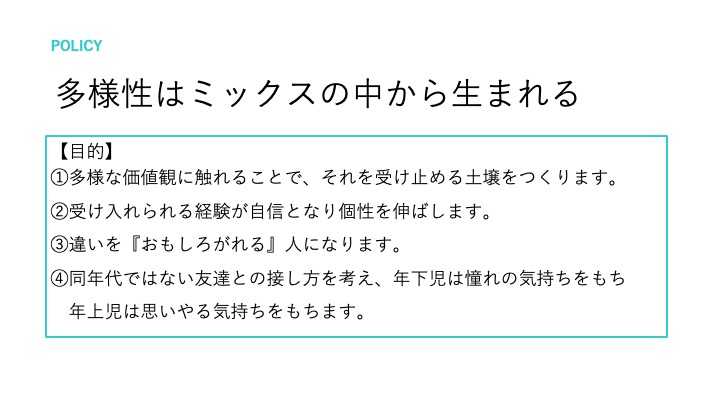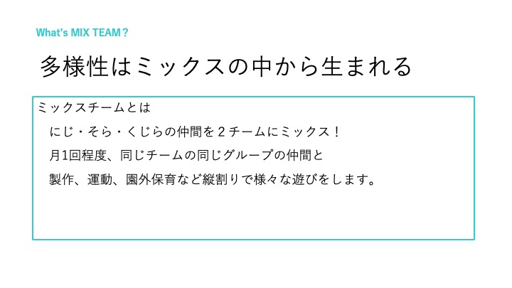 当園では2023年度から、3・4・5歳児クラス(通称:幼児クラス)のお友達を2グループに分かれて異年齢で活動する日を、毎月1回程度設けています。(縦割り保育といいます)