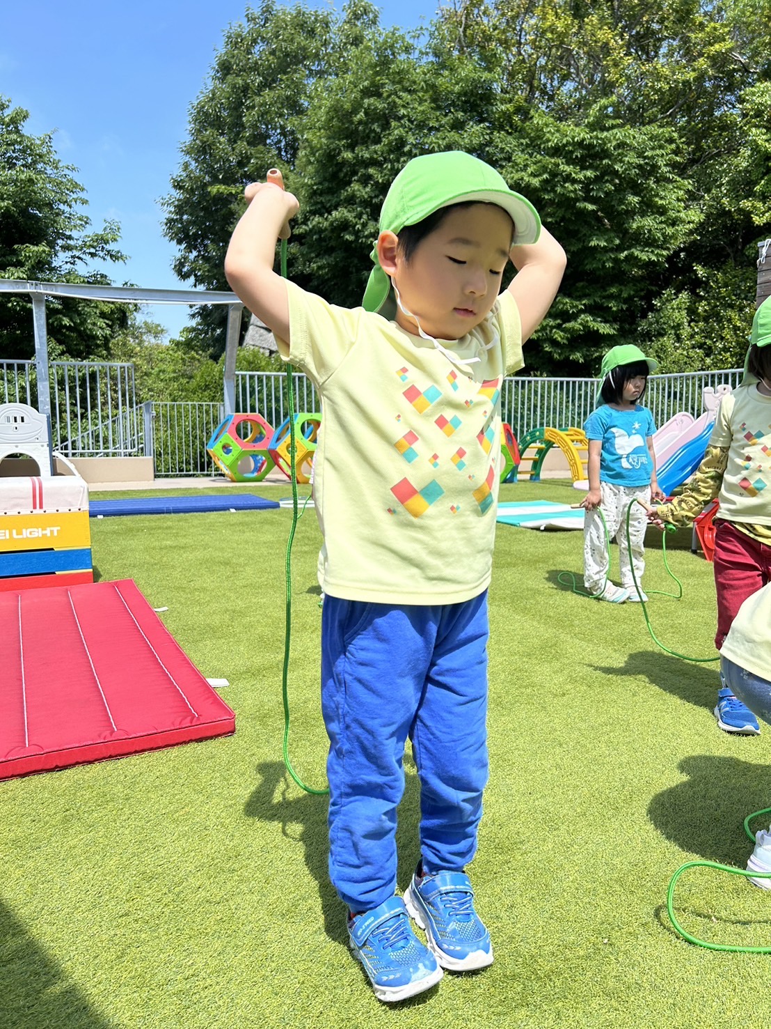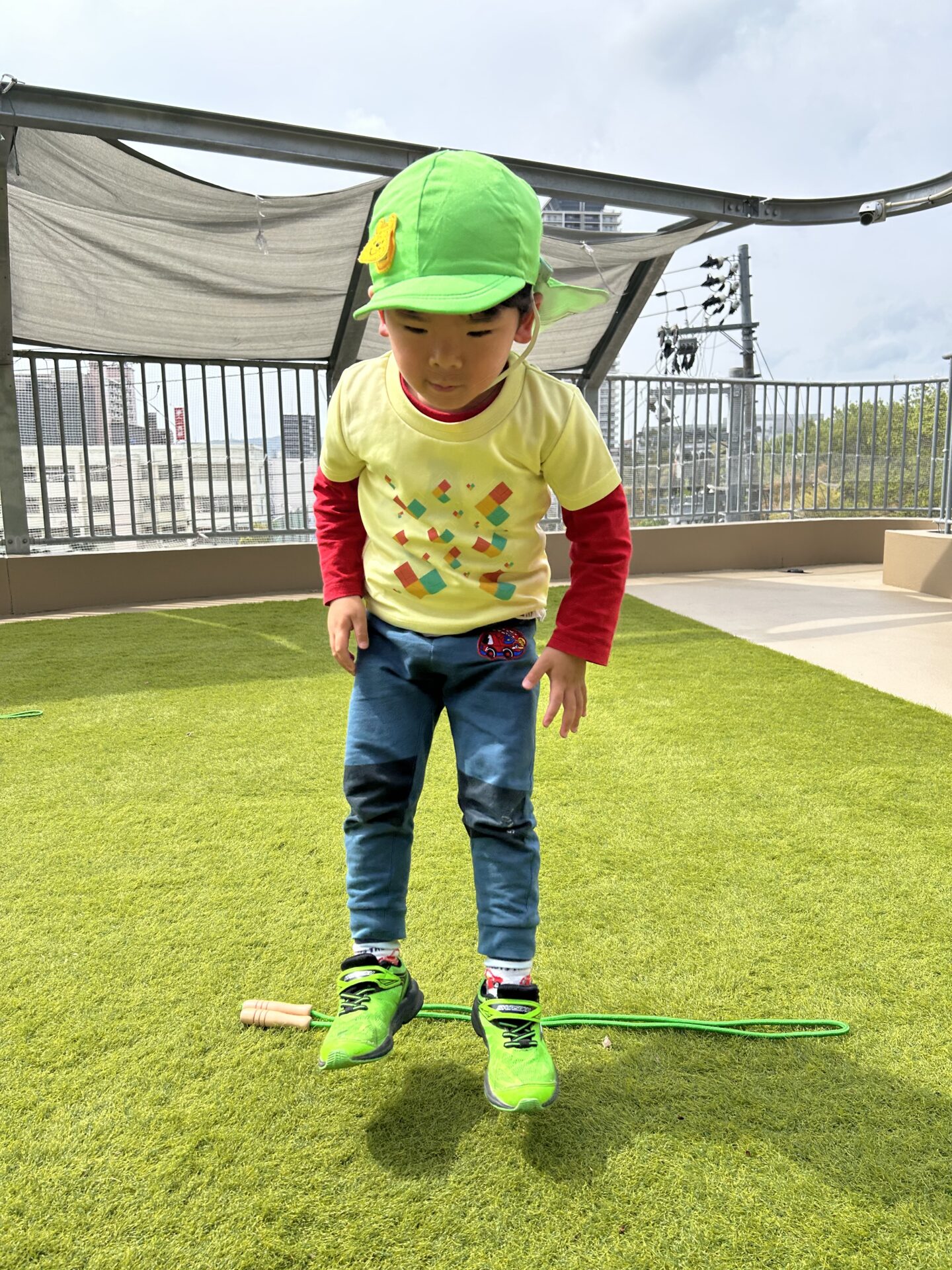 最近は「飛行機(縄を後にする)」「いらっしゃいませ(縄を前に持ってくる)」「ジャンプ」を繰り返し行い、流れが身に付くようにし、両足ジャンプで跳ぶ練習をしています。