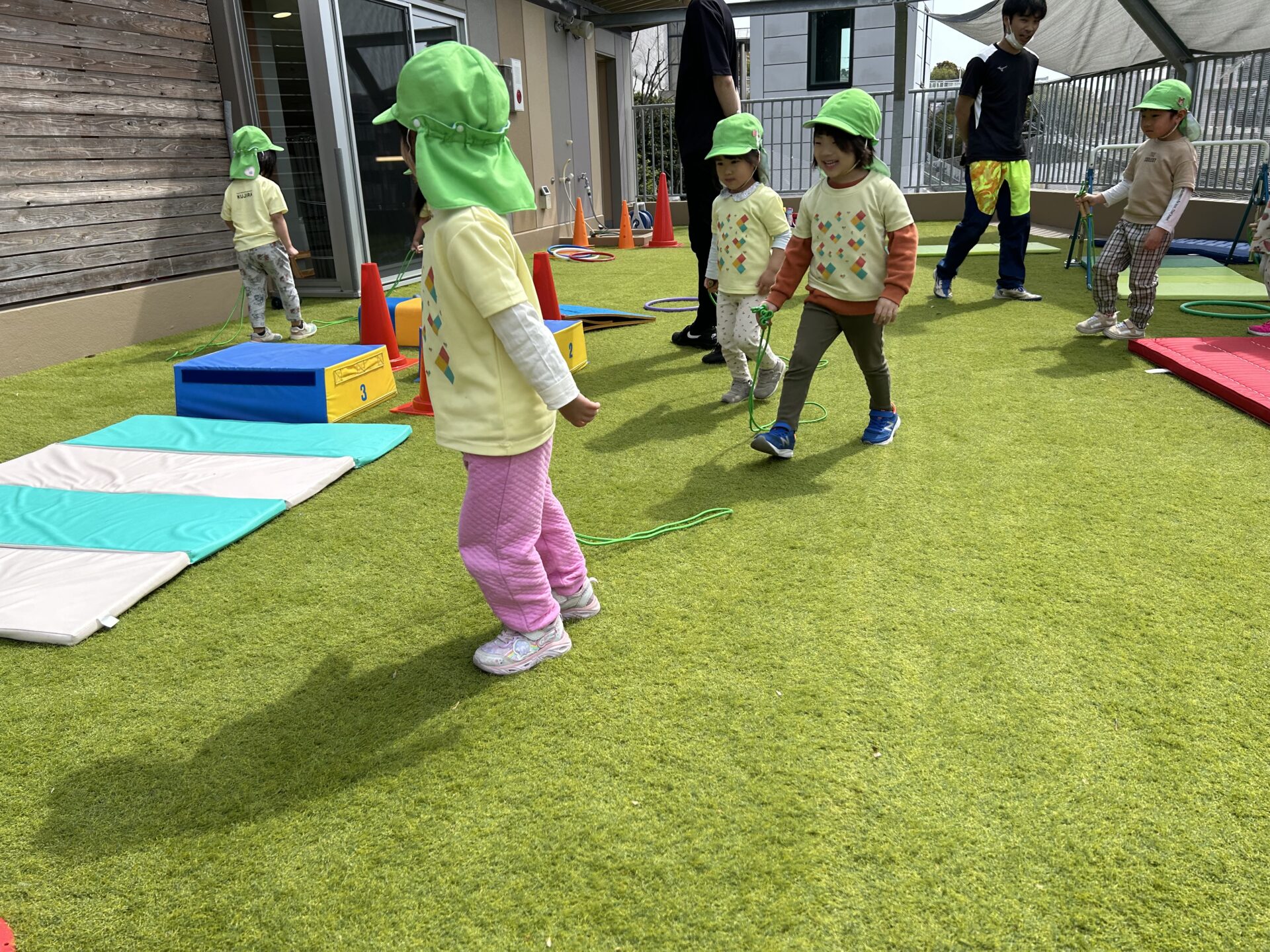 初めは縄跳びと触れ合う事を目的に縄を持ってお散歩したり、地面に置いて両足で跳ぶ練習をしました