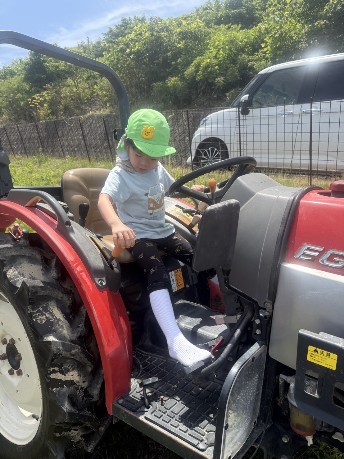 はじめにトラクターに乗せてもらうと、色んなレバーがカッコイイ✨と大喜びで、触ったり覗き込んだりしていました。