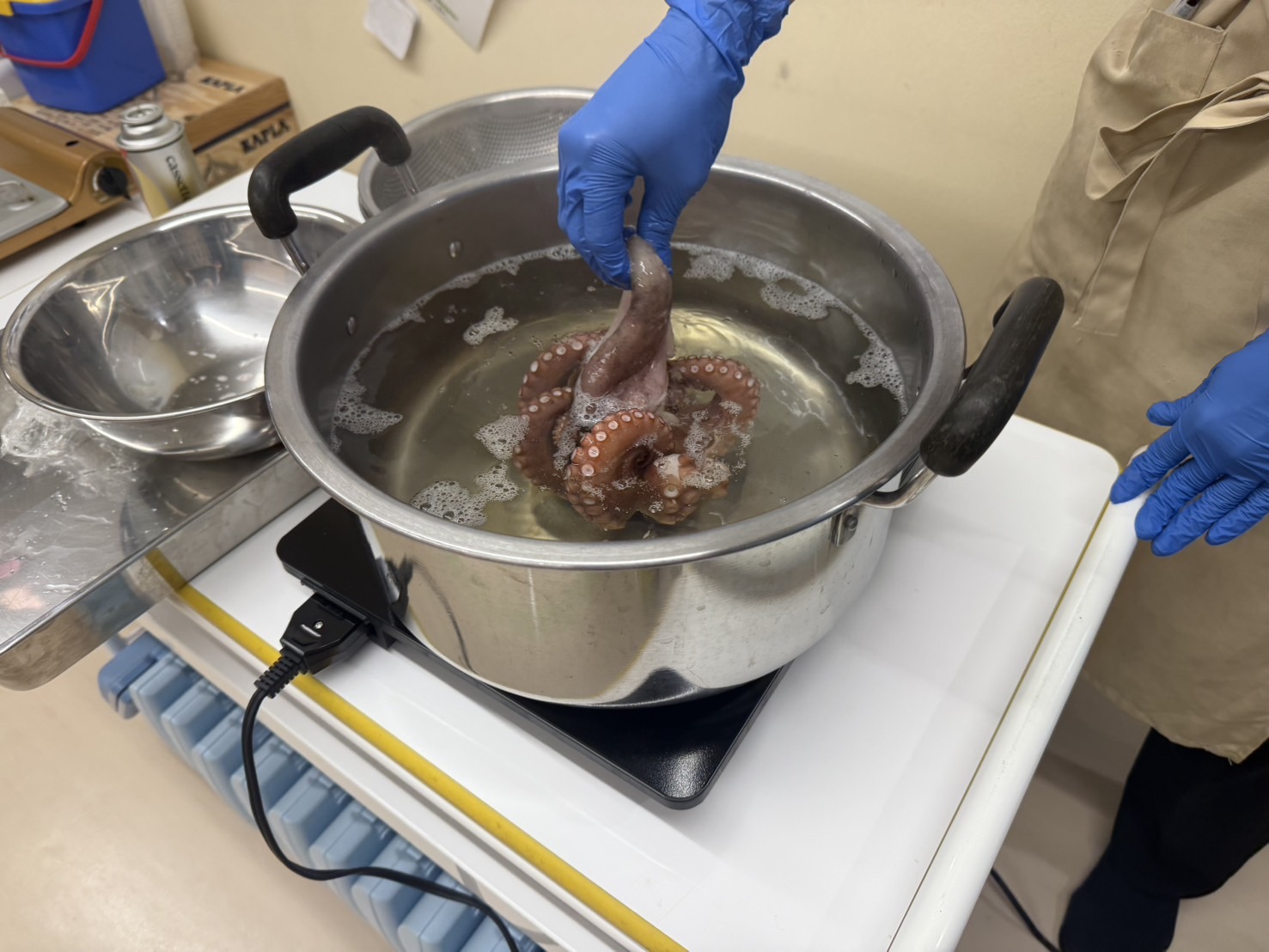 まずは生のタコをゆがく所から見学です。
