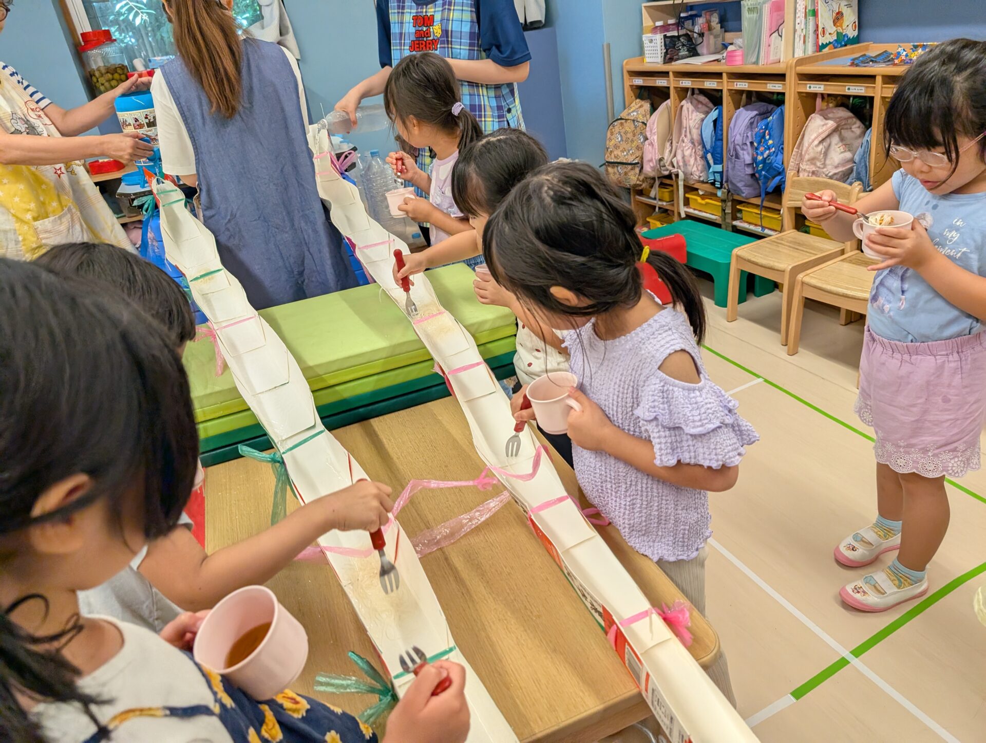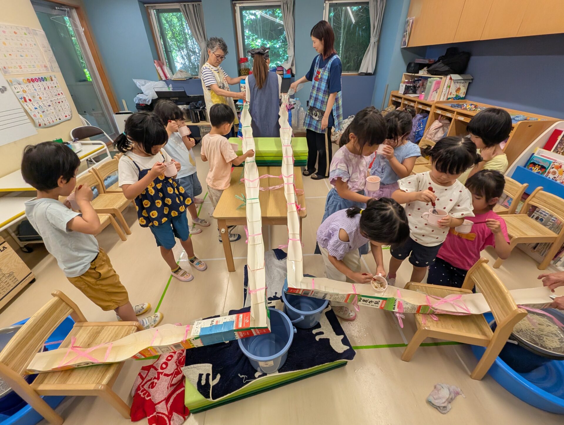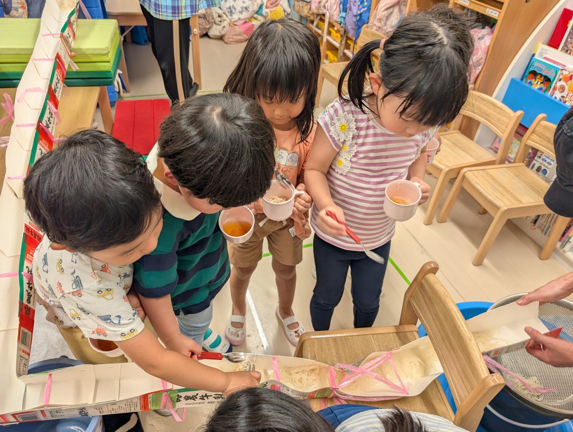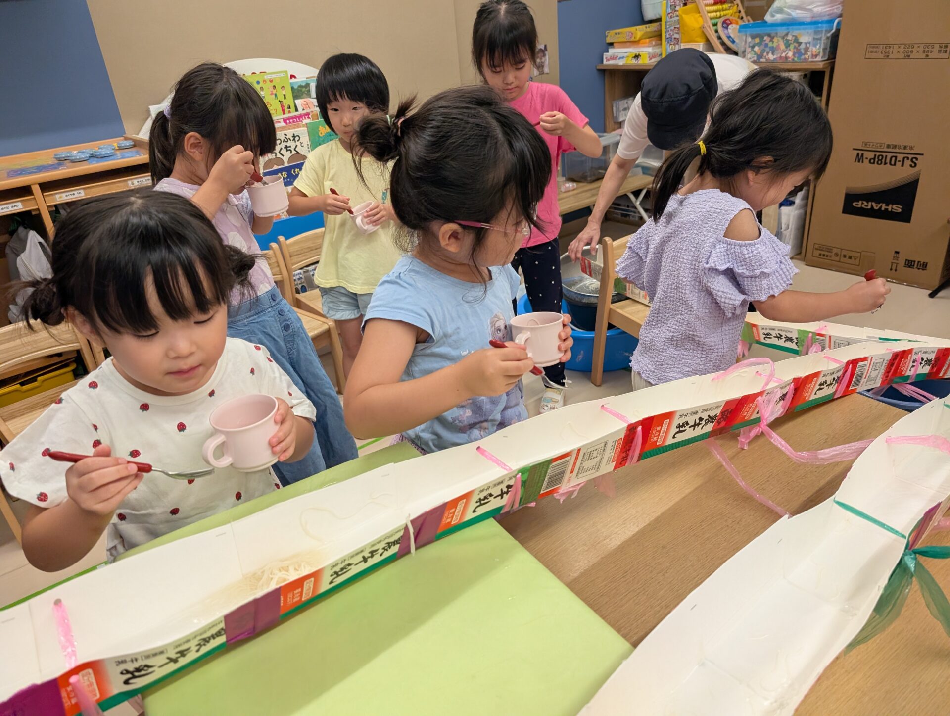 今日は七夕メニューのそうめんを、3歳児、4歳児、5歳児の3クラスが流しそうめんで楽しみました🥰