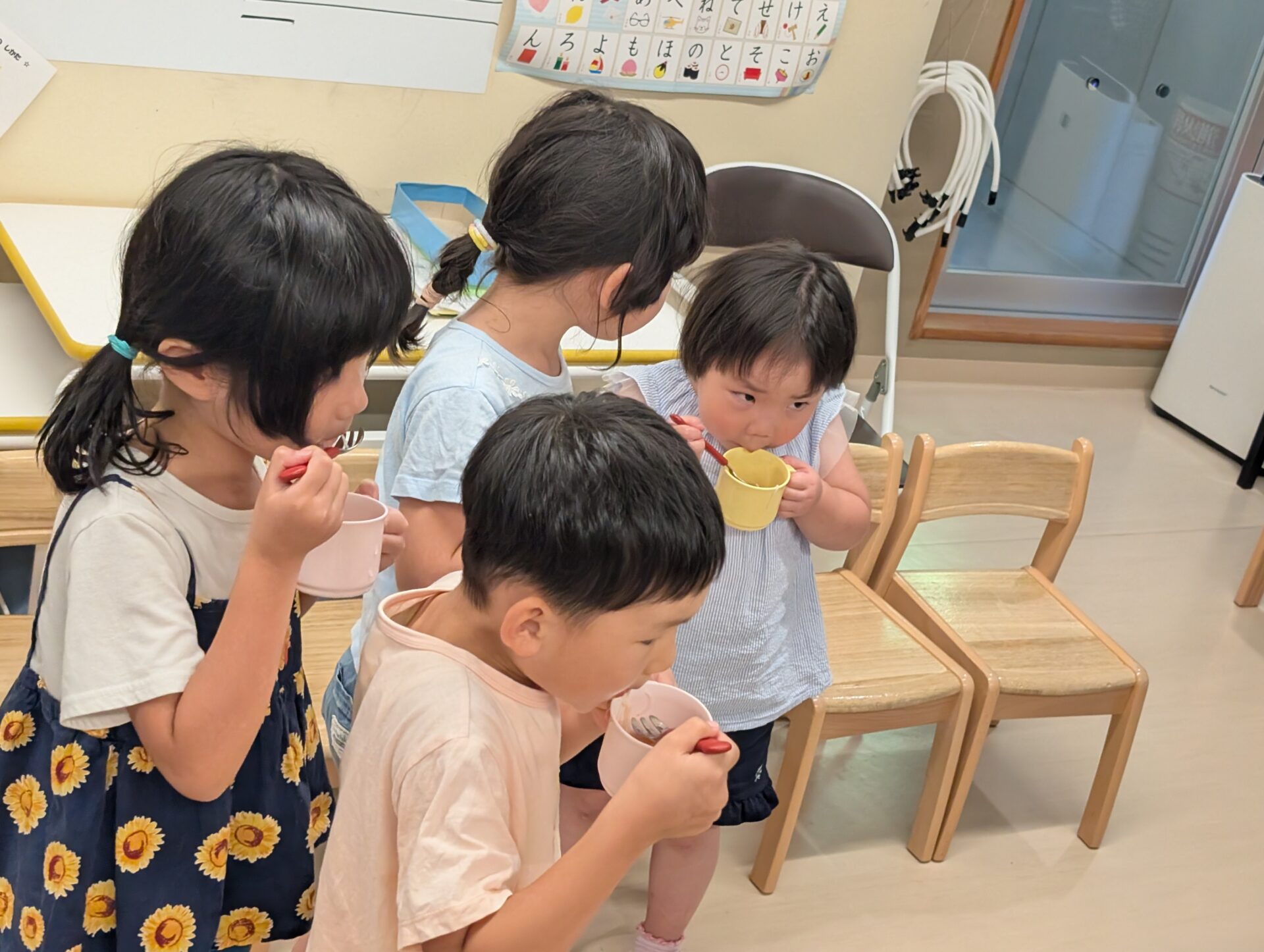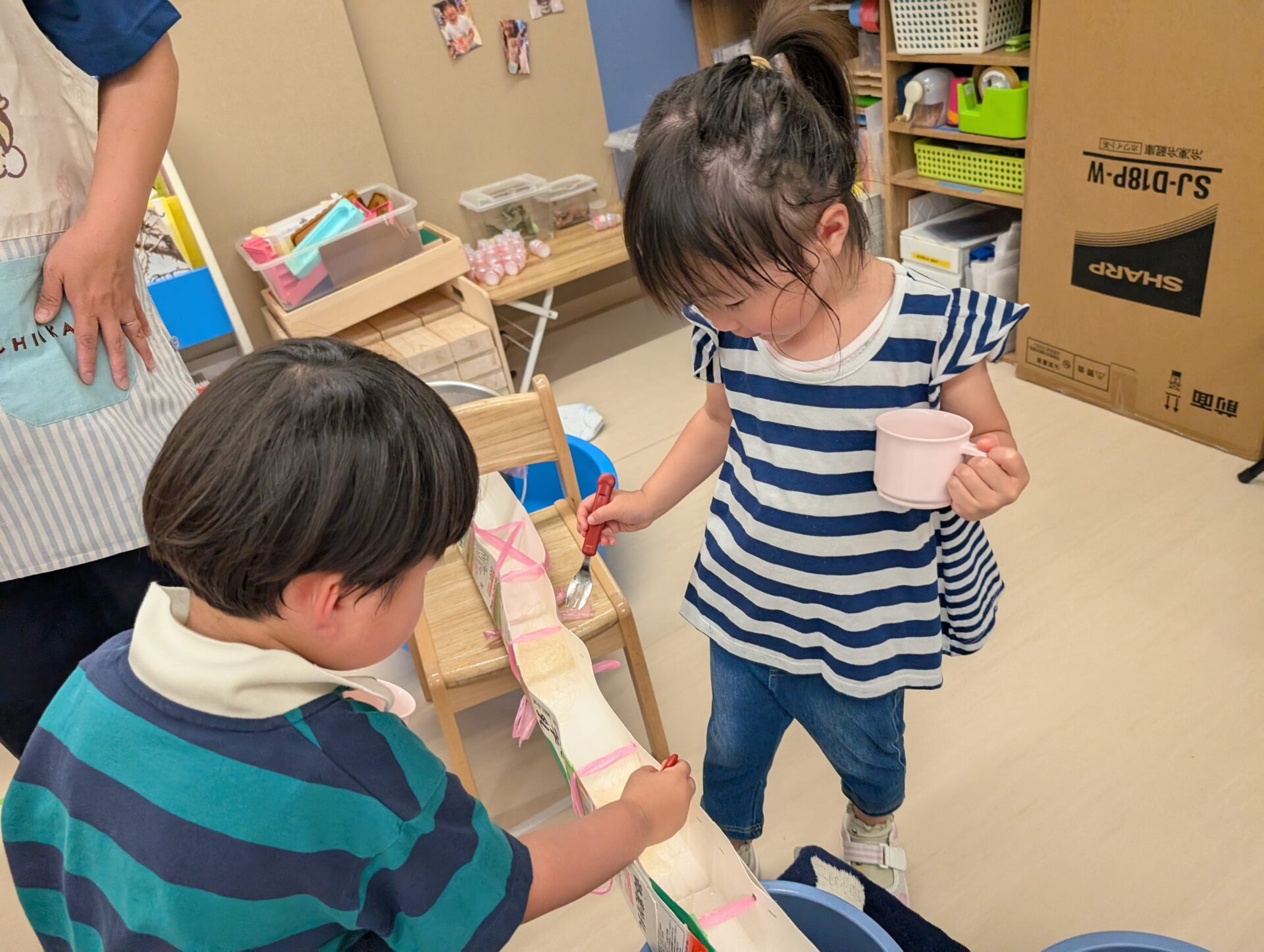 初めての流しそうめんに、最初はドキドキしていた3歳児の子ども達も、あちこちと自分の取りやすい所に移動しながら参加できました。