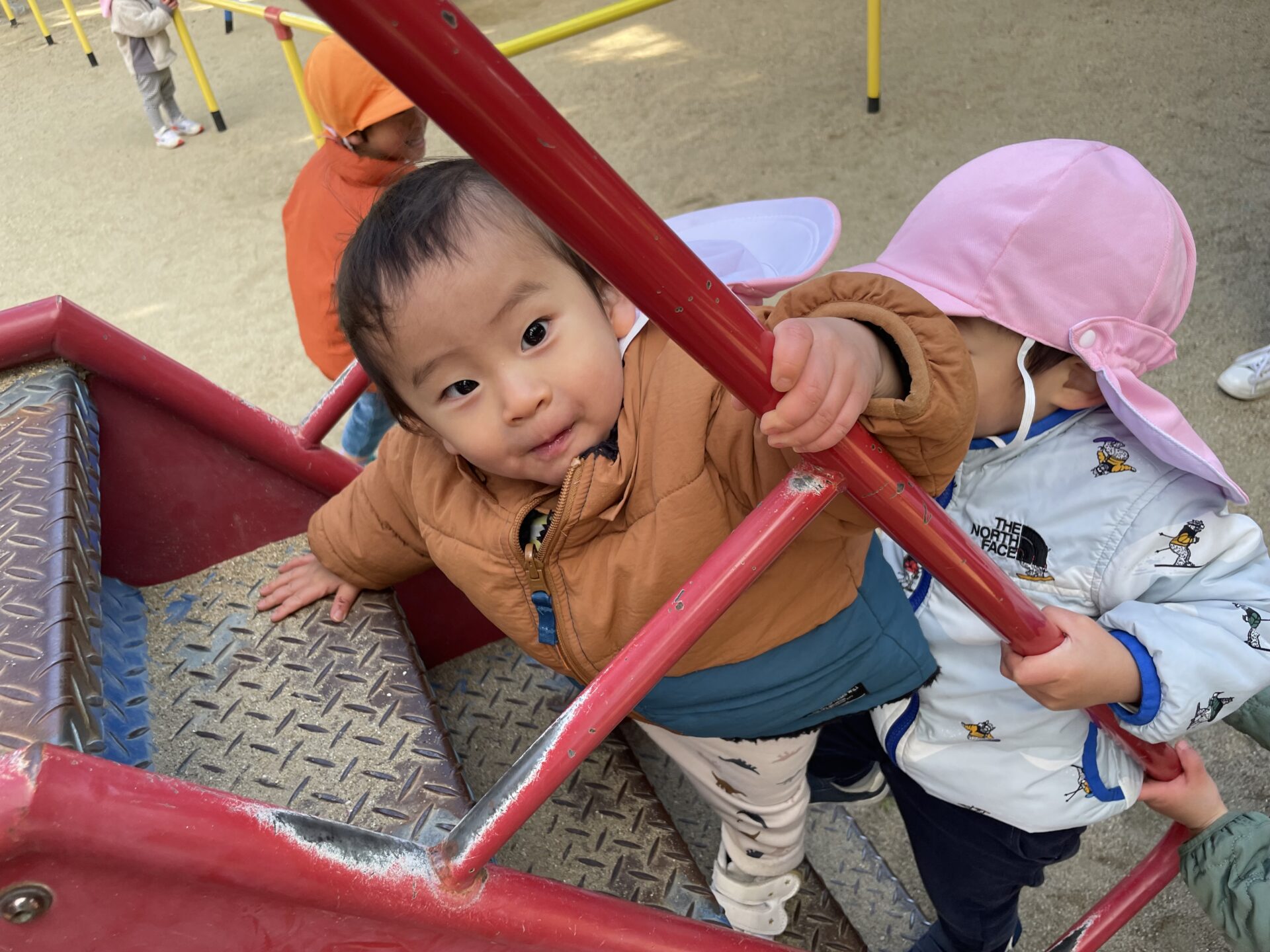 保育士に見守られながら、上手に登っています。