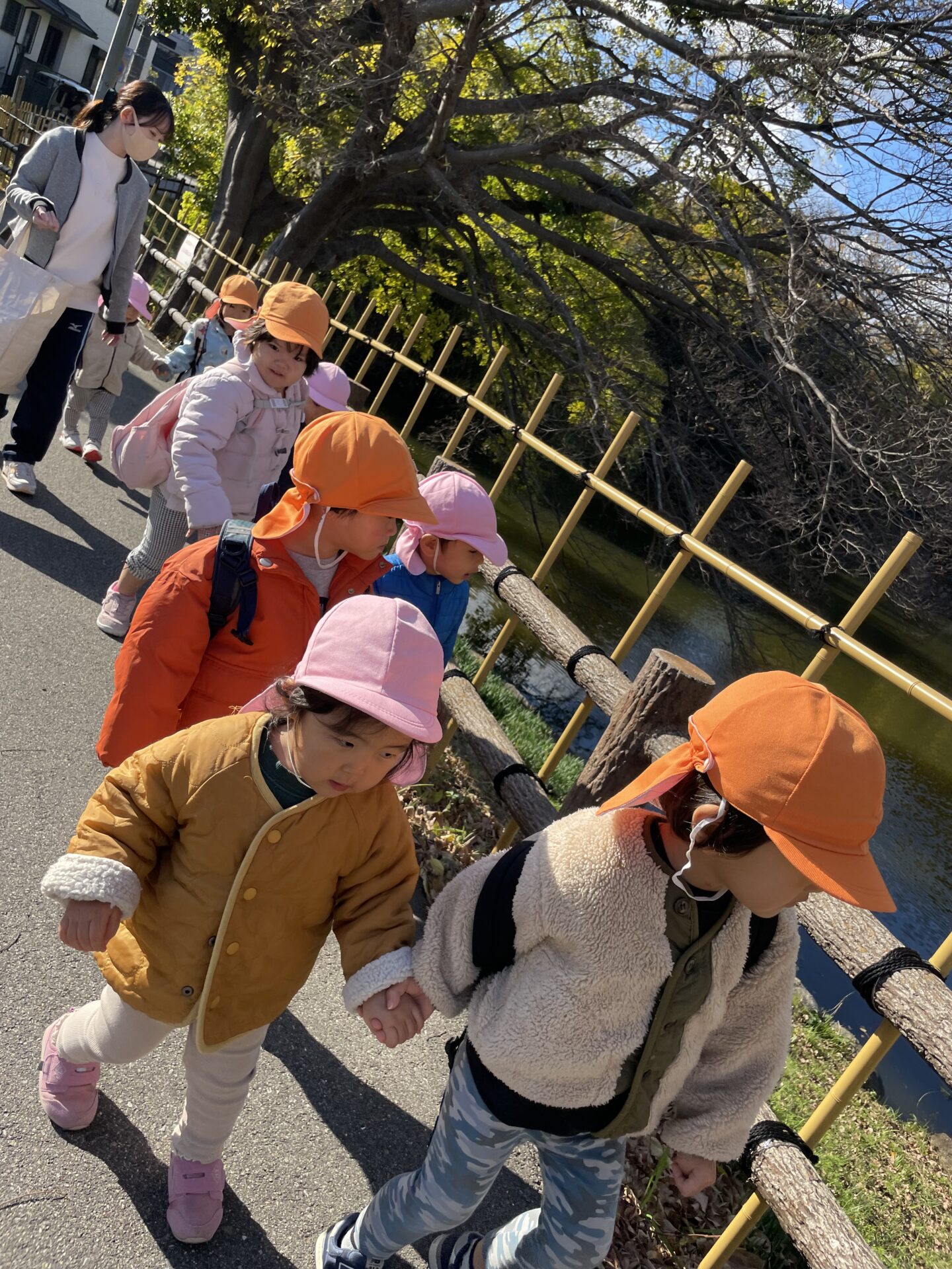 幼児さんに手を繋いでもらい一緒にお散歩に行きました。