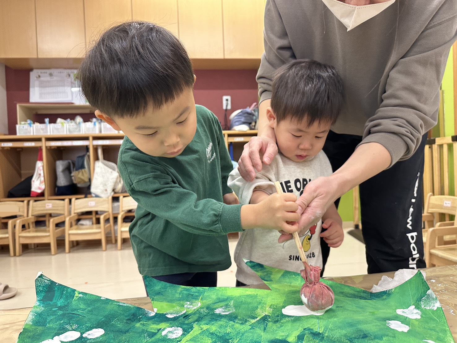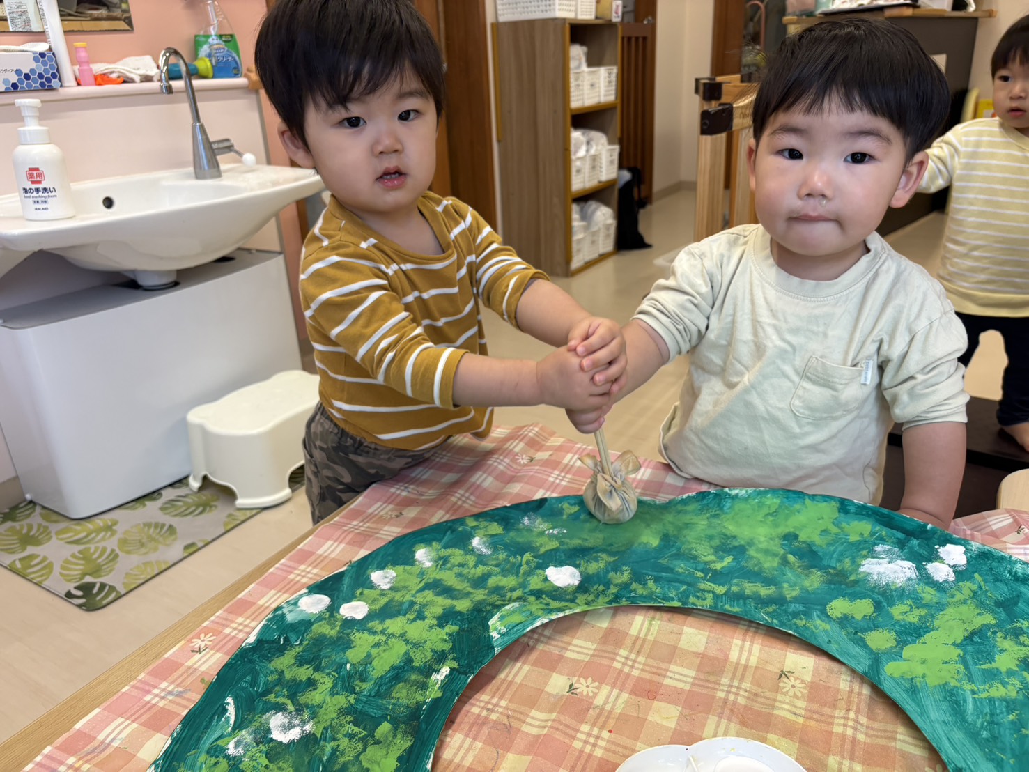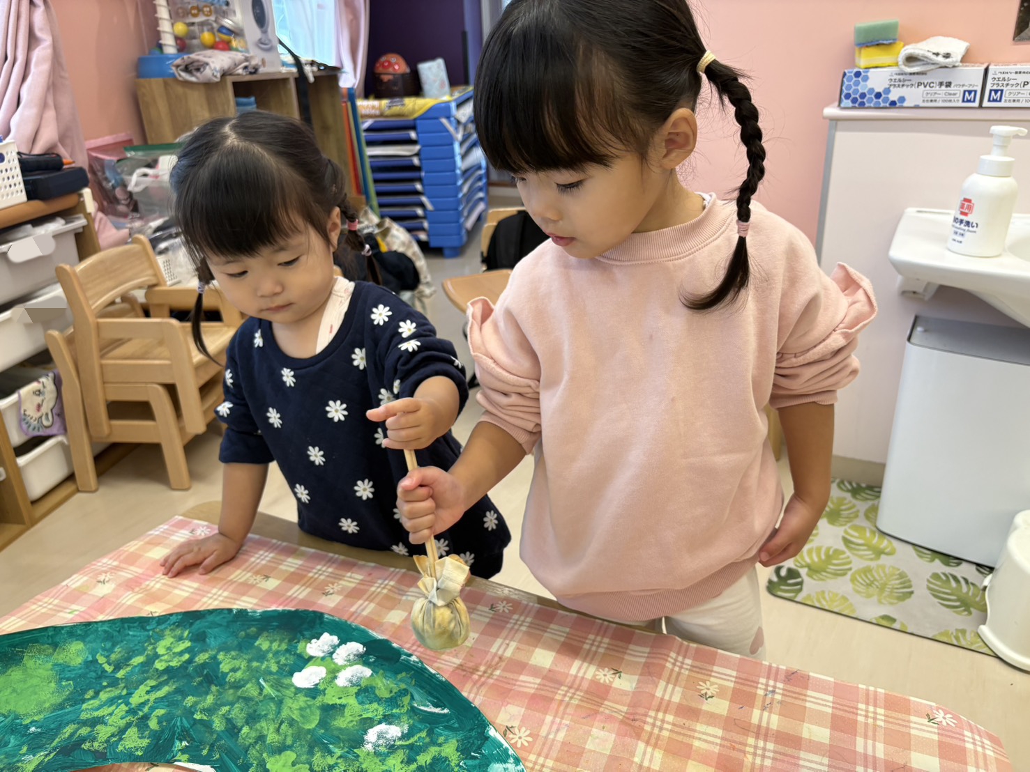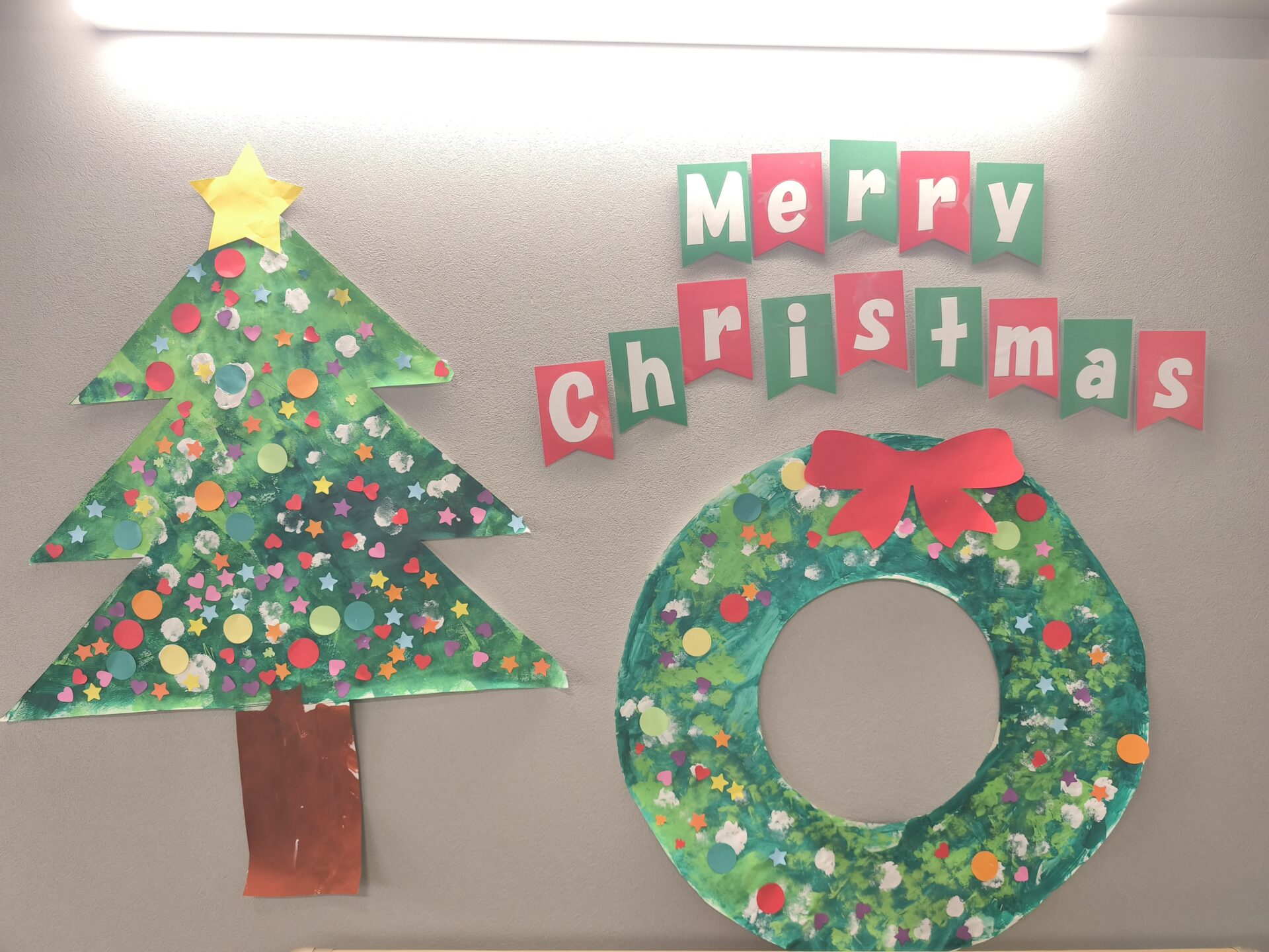 乳児 異年齢クラス交流(はぐっと・ぼこっとチーム)にて、先日大きなクリスマスツリー、クリスマスリースづくりをしました。
