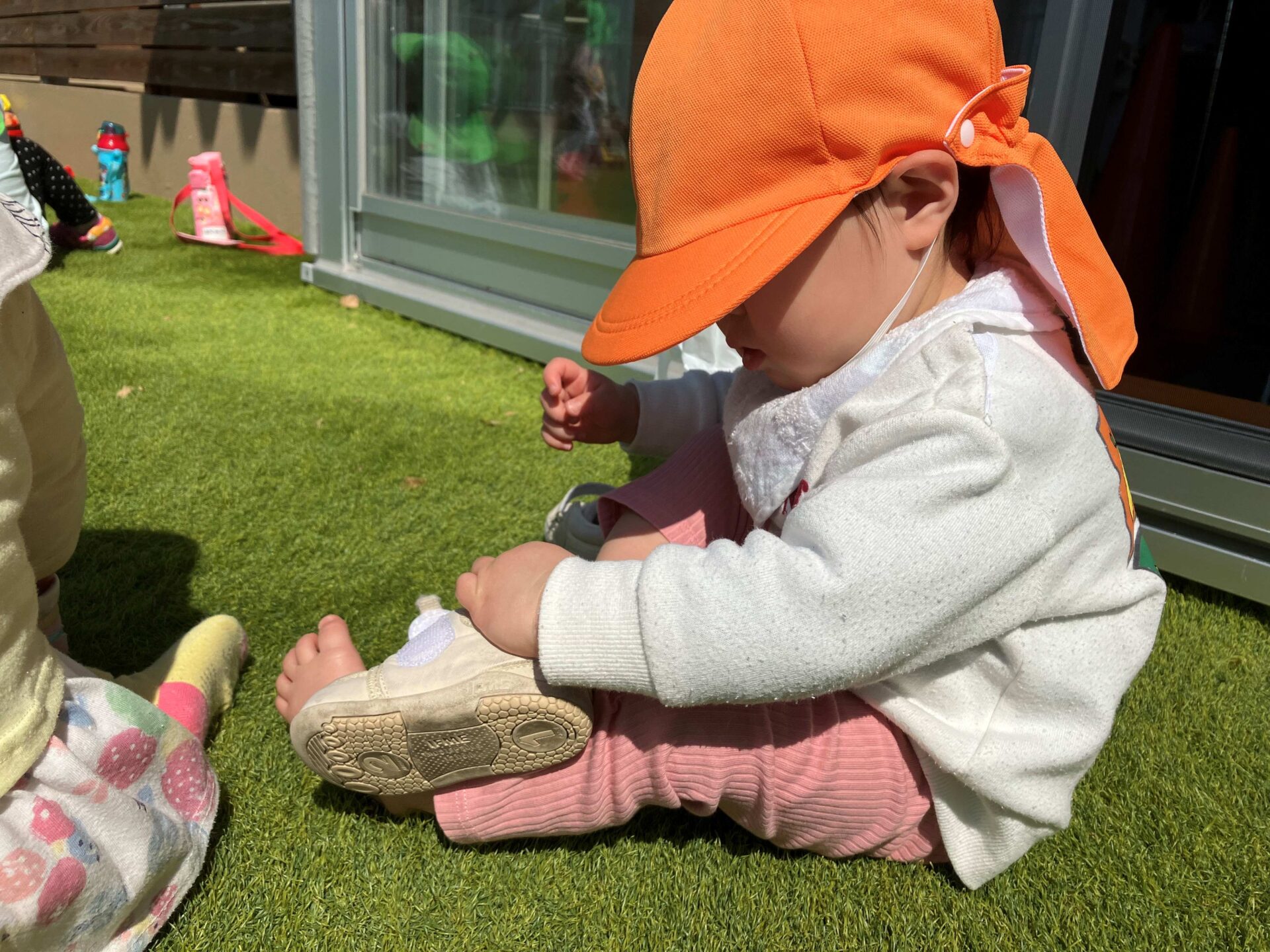 2023年4月4日撮影、靴をはこうとしている1歳児クラスに進級したばかりのお友だちの写真です。