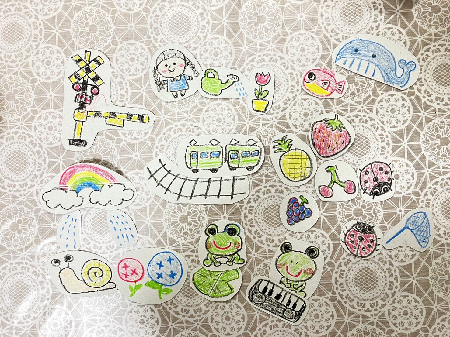 クレヨンやマーカーなどで絵を描いて切りとるだけで完成です。