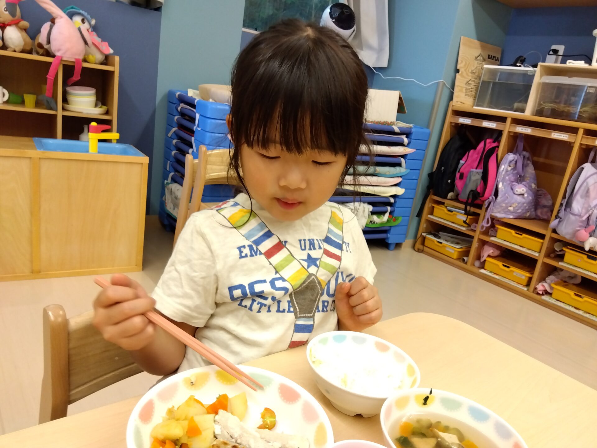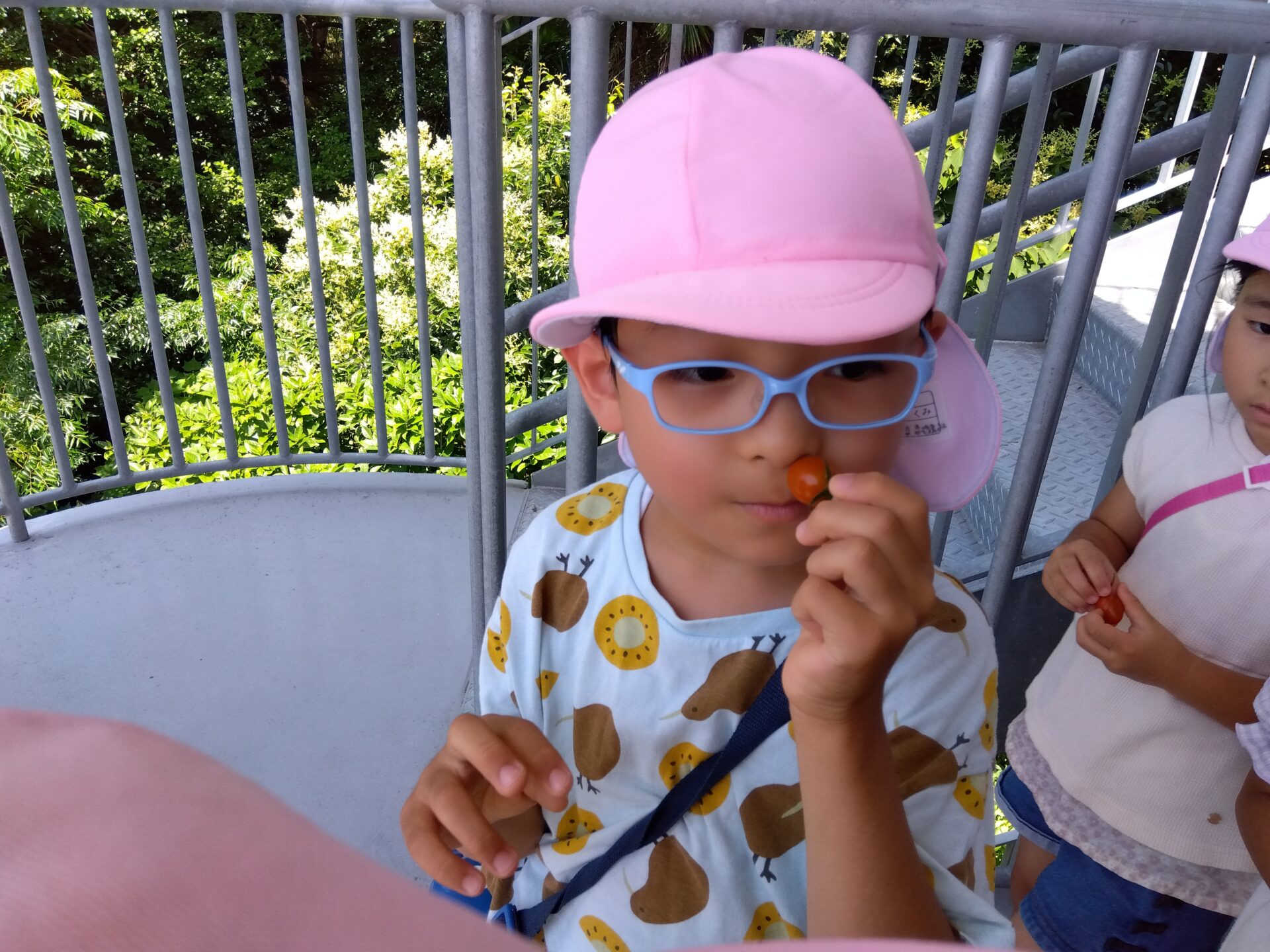 食べ始めた途端「食べてみよう」と、ひとくち目にミニトマトを食べる子、「最後にとっておくの」と最後のひとくちまで大事にとっておく子。みんなで毎日水やりをして育てたミニトマト、たったひとくちが子どもたちにとって、とても大切なひとくちなんだと見ていて感じました。