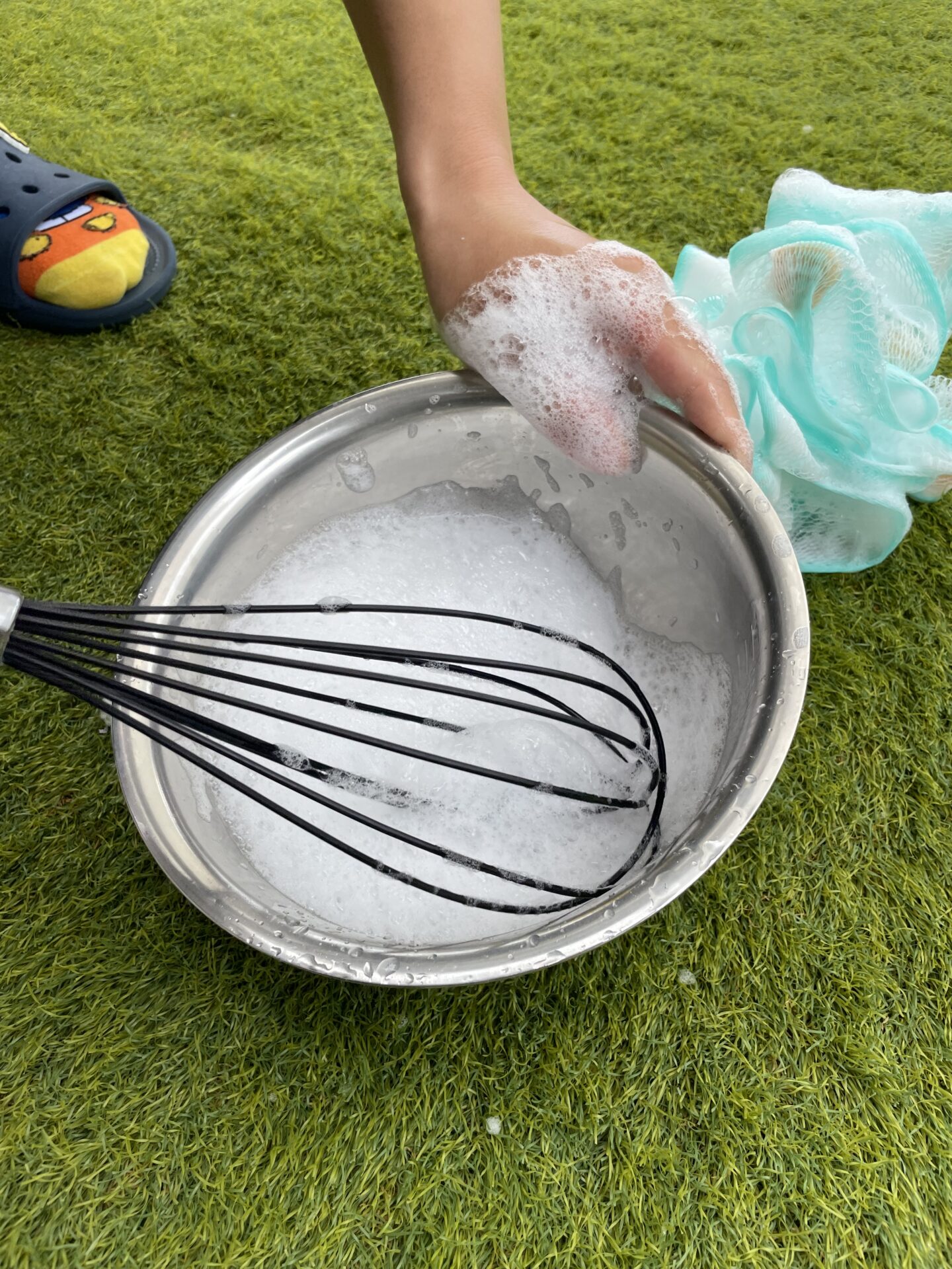 ②すれた石鹸をボウルに入れて泡立て器で泡だたてます🥣